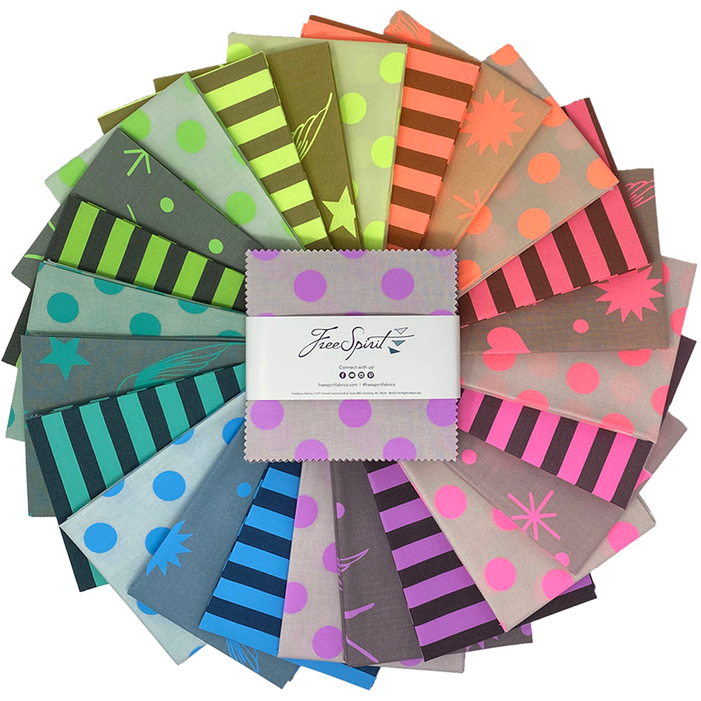 Tula Pink's "Neon True Colors" collection is a vibrant, eye-catching assortment of fabrics that features bold, electrifying hues. This collection offers a modern twist on her signature True Colors designs, incorporating neon shades like electric pink, bright turquoise, vivid orange, and neon yellow. The designs feature classic Tula motifs, such as whimsical birds, tonal stripes, and playful dots, all reimagined in these striking colors. Perfect for adding a pop of brightness to quilts, home décor, and accessories, this collection is a must-have for anyone looking to make a bold statement in their projects.