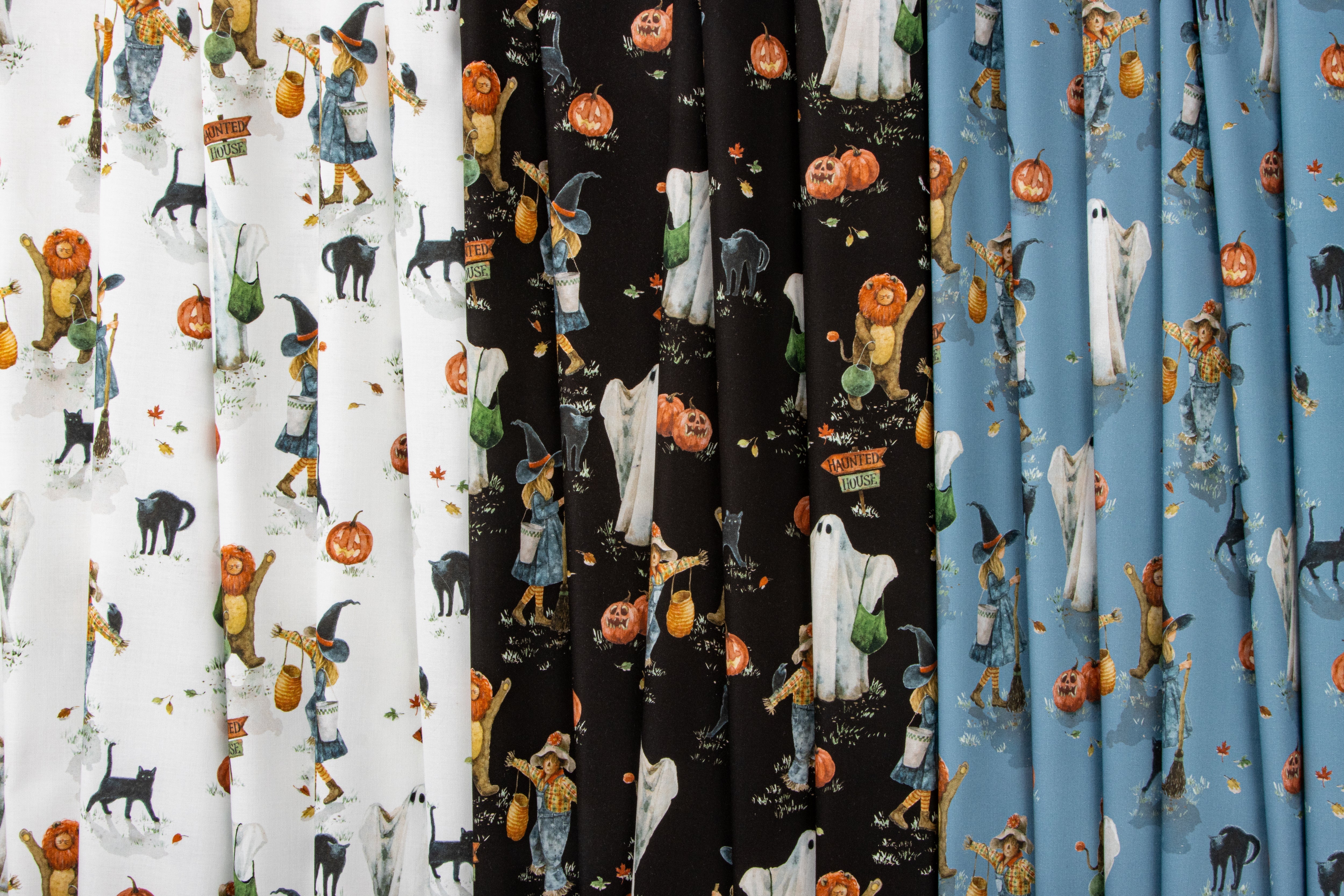 Trick or Treat by Lisa Audit for Riley Blake Designs is a whimsical Halloween collection featuring watercolor-style illustrations of pumpkins, black cats, ghosts, witches, and fall foliage. Rendered in a moody palette of dusk, black, orange, cream, and plum, the prints blend spooky charm with artistic elegance. Coordinating designs include festive florals, silhouettes, and textural blenders—perfect for seasonal quilts, home décor, or trick-or-treat accessories.