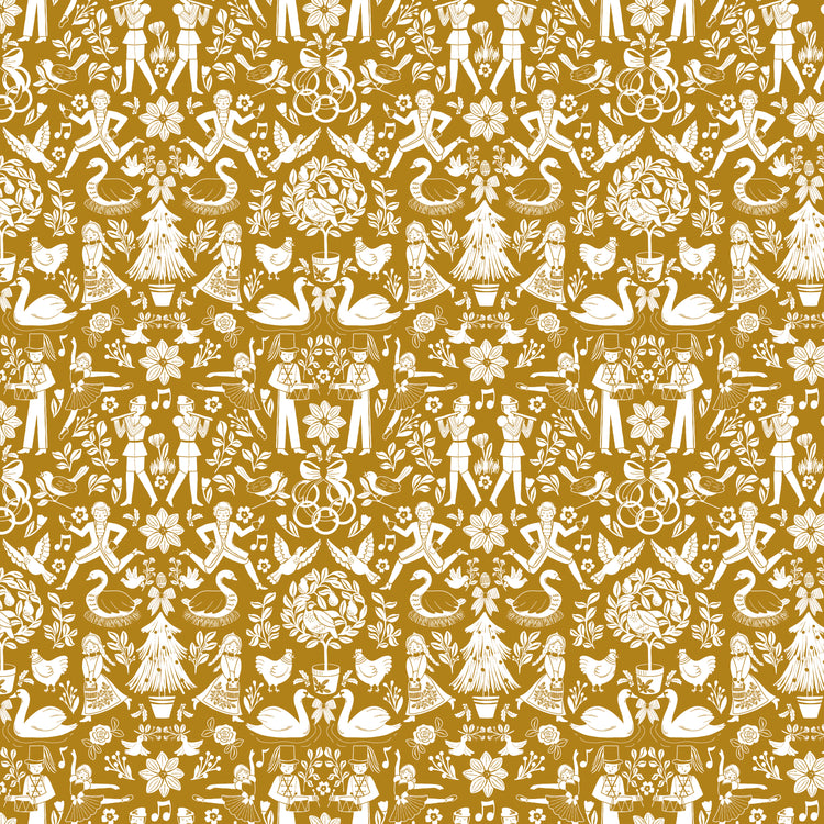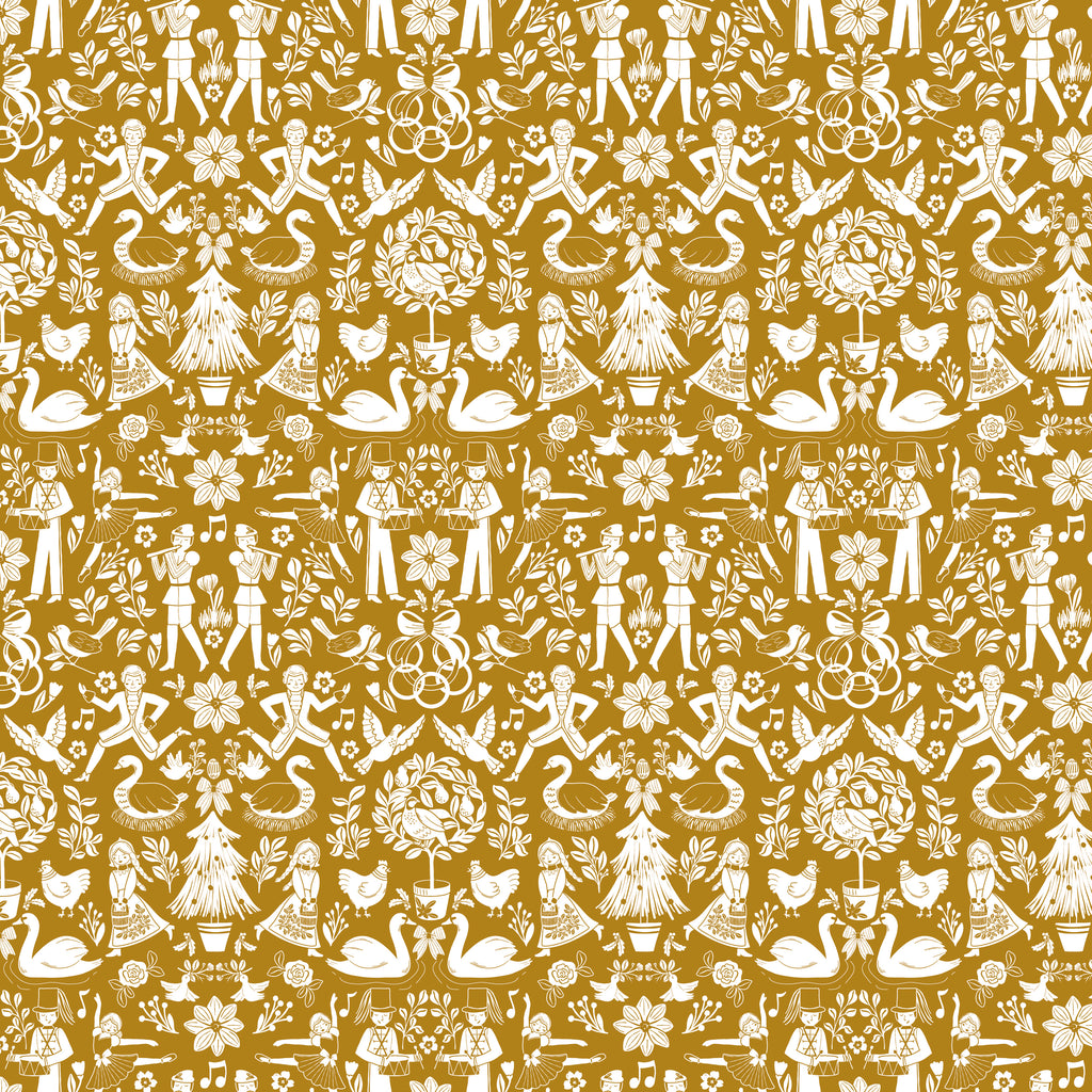 This tone-on-tone print features characters and icons from The Twelve Days of Christmas.