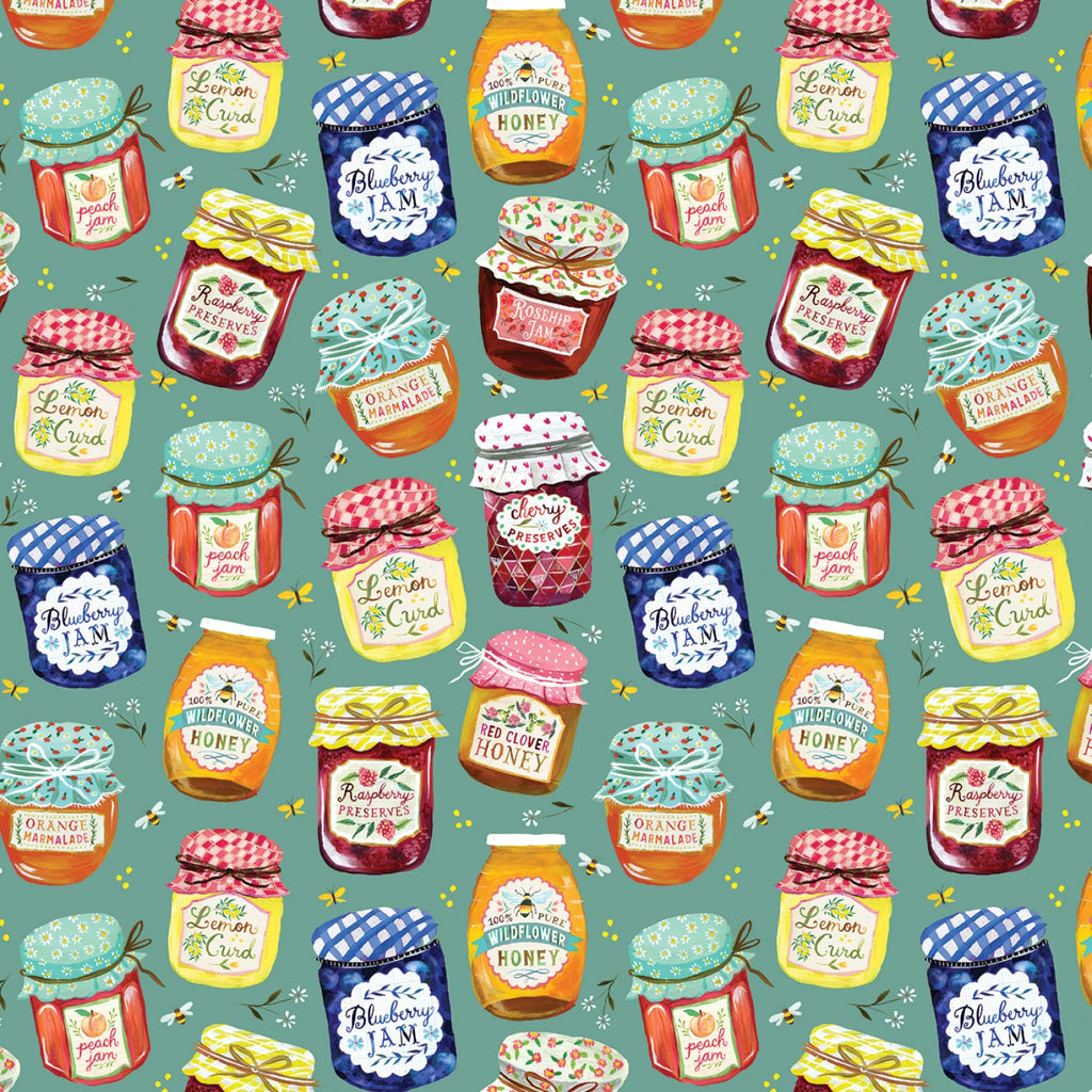 Jam Jars – Teal features a charming scatter of illustrated jam, honey, and marmalade jars, each with hand-lettered labels and vintage-inspired details. The playful palette and cozy canning motifs give this print a warm, farmhouse feel without being overly themed. A cheerful choice for quilts, kitchen décor, and nostalgic sewing projects.