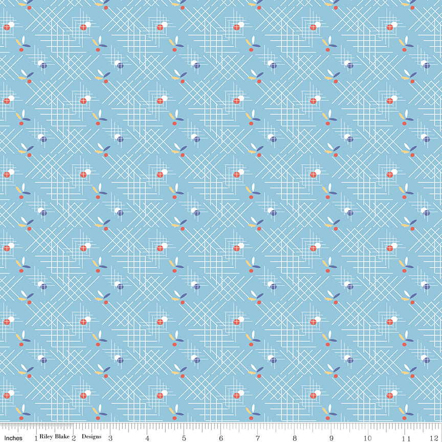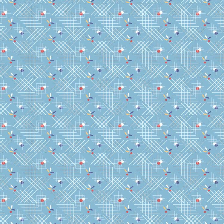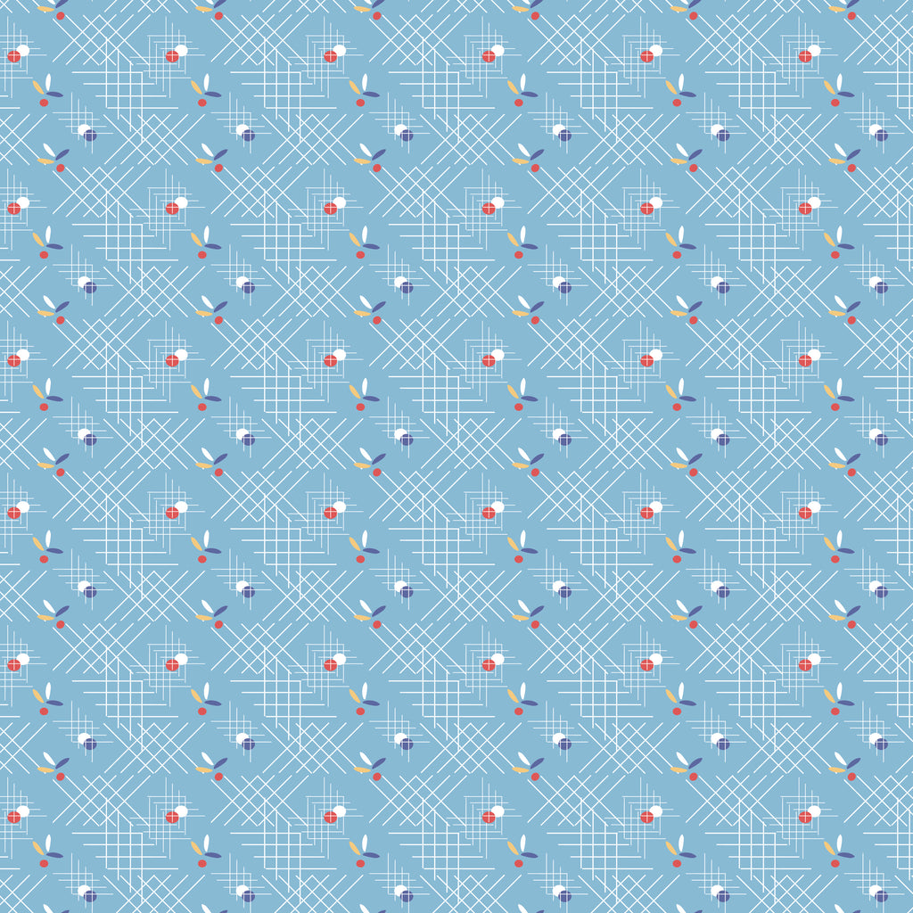 This print features occasional dots and leaves on a sky blue background with white criss-cross lines.