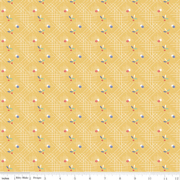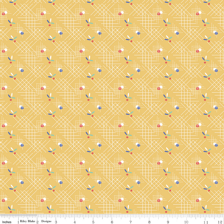 This print features occasional dots and leaves on a yellow background with white criss-cross lines.