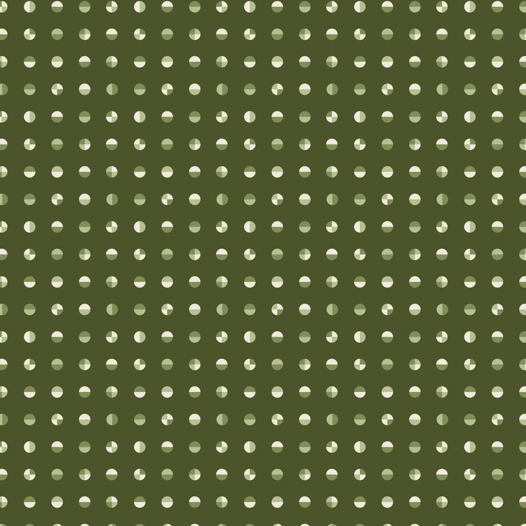 Circular – Quiet Green features a small-scale dot pattern with softly segmented circles that add subtle texture and rhythm. The deep, muted green background with gentle tonal contrast gives it a calm, midcentury feel that reads as a true blender rather than a statement print. Printed on 100% organic quilter’s weight cotton, it’s well suited for backgrounds, sashing, borders, binding, and modern quilt designs.