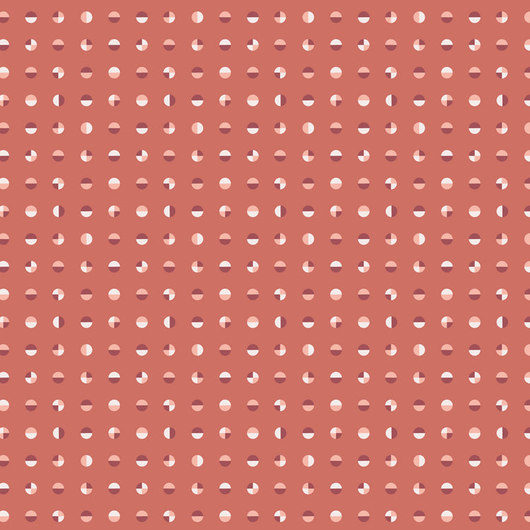 Circular – Raspberry features a small-scale dot pattern made up of softly segmented circles that add subtle texture without reading busy. The warm raspberry ground with gentle tonal contrast gives it a modern, midcentury feel that works beautifully as a supporting print. Printed on 100% organic quilter’s weight cotton, it’s an excellent choice for backgrounds, sashing, borders, and binding.