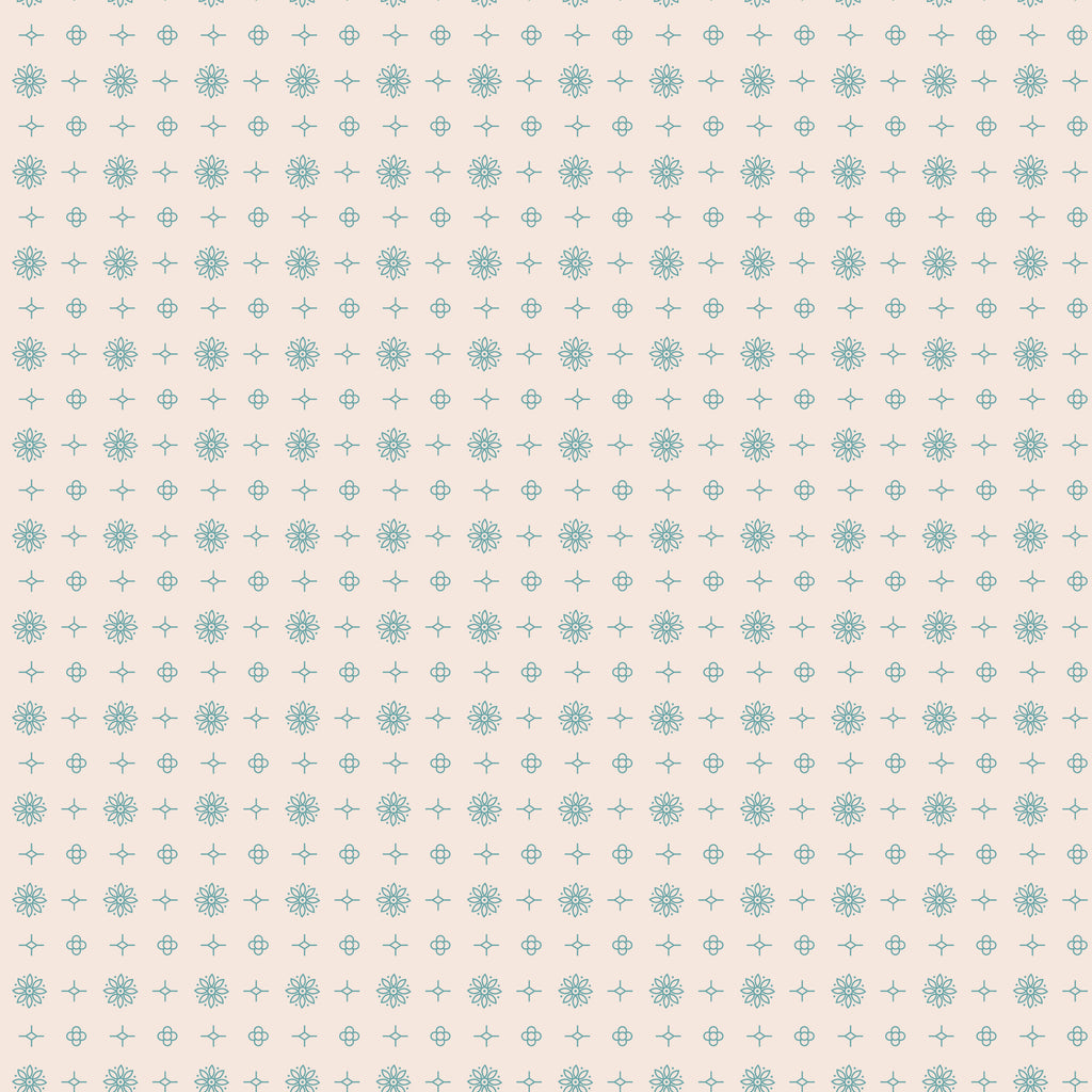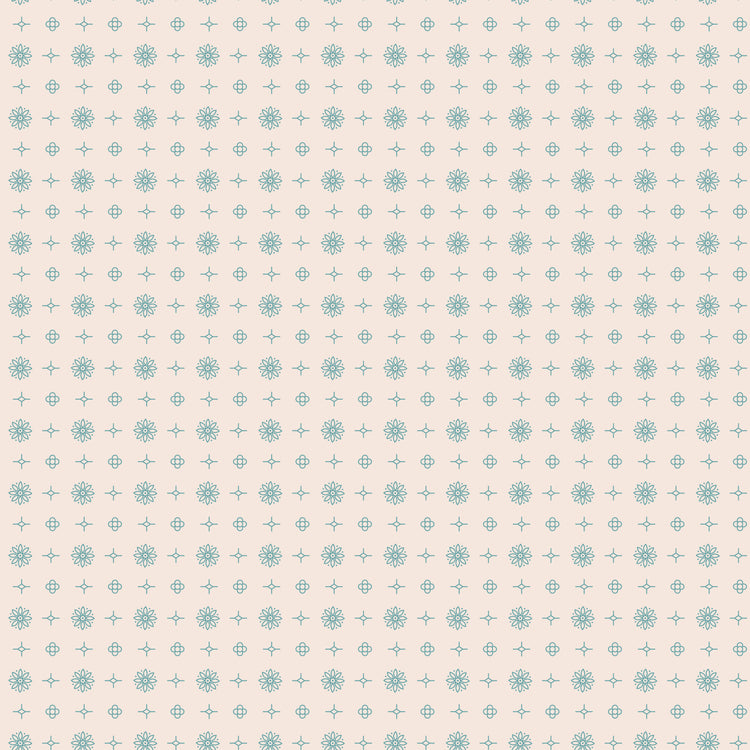 This fabric features a delicate and charming design with small, evenly spaced blue starburst and floral motifs on a soft, light peach background. The pattern is subtle yet intricate, providing a versatile backdrop for various sewing projects, from quilting to apparel. Its 100% cotton composition ensures comfort and breathability.