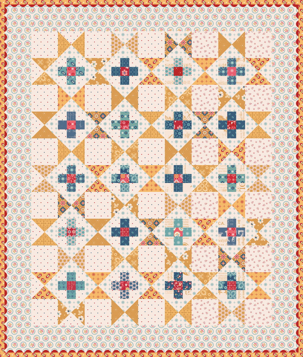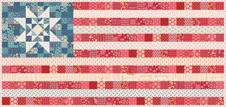 The Oh Beautiful Flag Runner & Amber Waves Mini Quilt Kit includes pattern and fabric for runner and quilt top and binding. Backing and optional vintage trim is not included. Fabric featured is Americana by Lori Holt of Bee in my Bonnet. Pattern is also by Lori. Finished runner size is 26" x 56". Finished mini quilt size is 33" x 39". Kit comes in a Bee Cute Project Box. Box size is approximately 10" x 9 1/2" x 3".