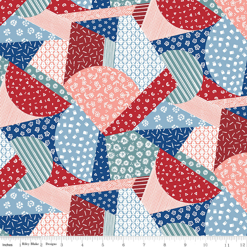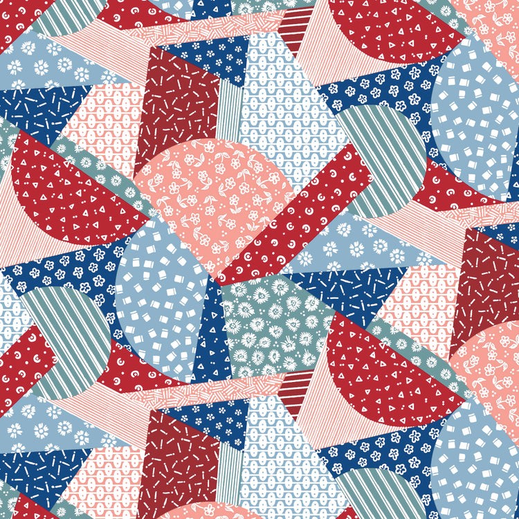 This cheater print features a patchwork-like array of shapes with floral and geometric patterns in shade of red and blue. Printed on Liberty's signature Lasenby cotton, it is well-suited for quilting, apparel, and other craft projects.