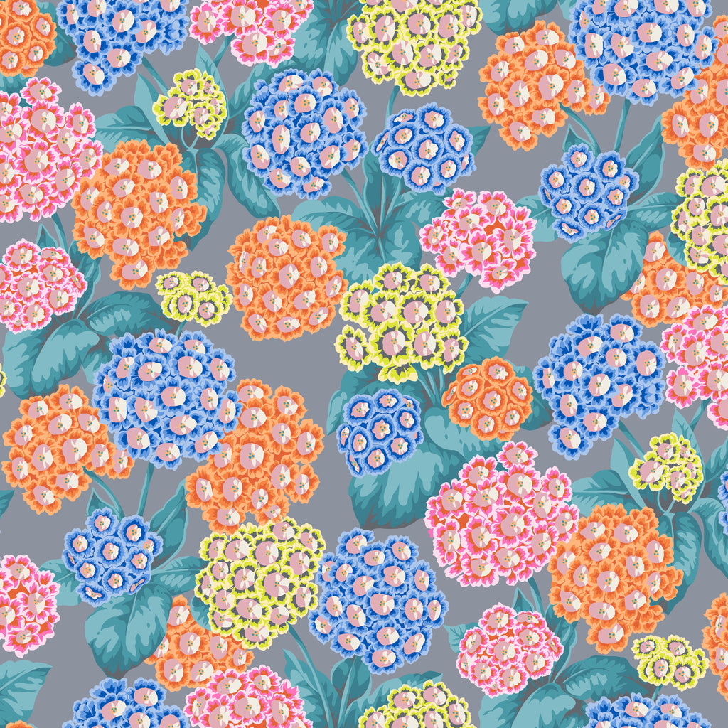 Alpines – Pastel by Philip Jacobs for the Kaffe Fassett Collective showcases clusters of alpine blossoms in soft blue, pink, orange, and yellow with lush teal-green leaves, all set against a cool grey background. The painterly detail and naturalistic style make this floral a versatile choice for quilt backdrops, large blocks, and striking home décor projects.