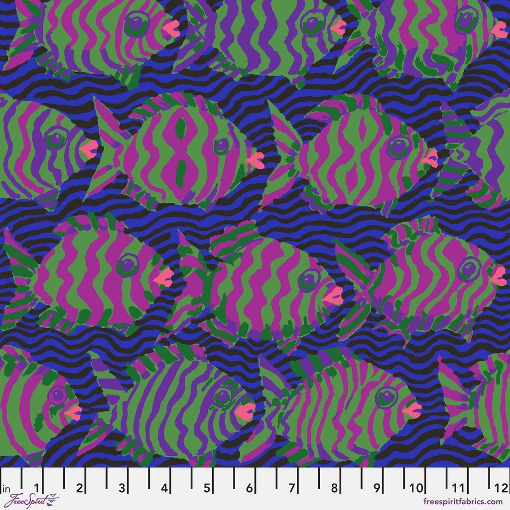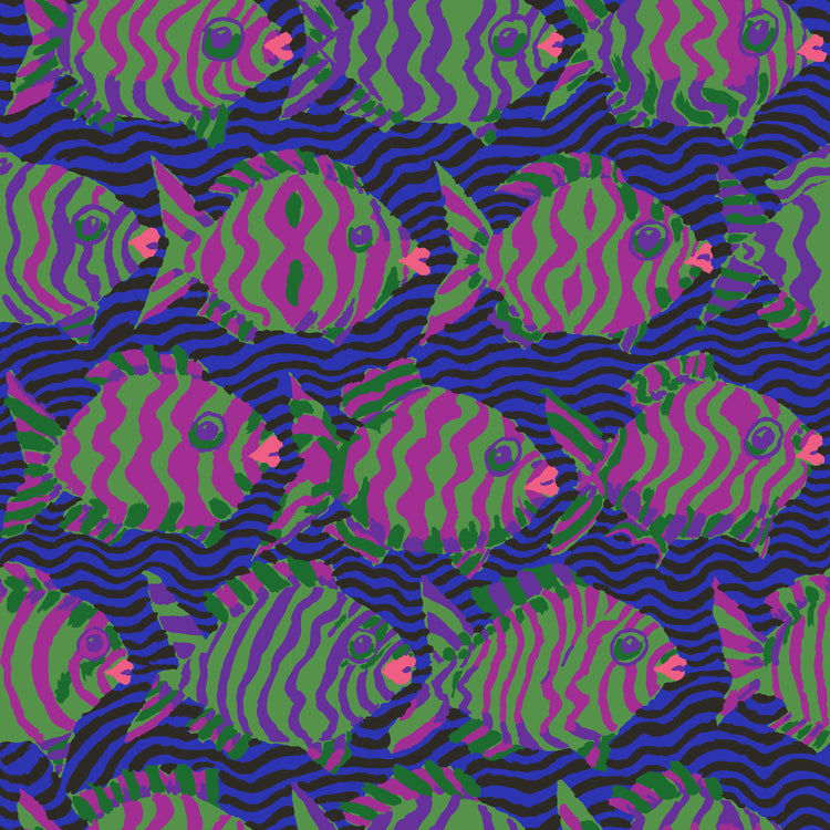 Minnows – Blue by Brandon Mably for the Kaffe Fassett Collective features striped fish in vivid green and magenta swimming across a deep navy background with wavy cobalt accents. The bold contrast and dynamic movement give this design a dramatic, underwater energy, making it an excellent choice for statement quilts, striking décor, or standout apparel.