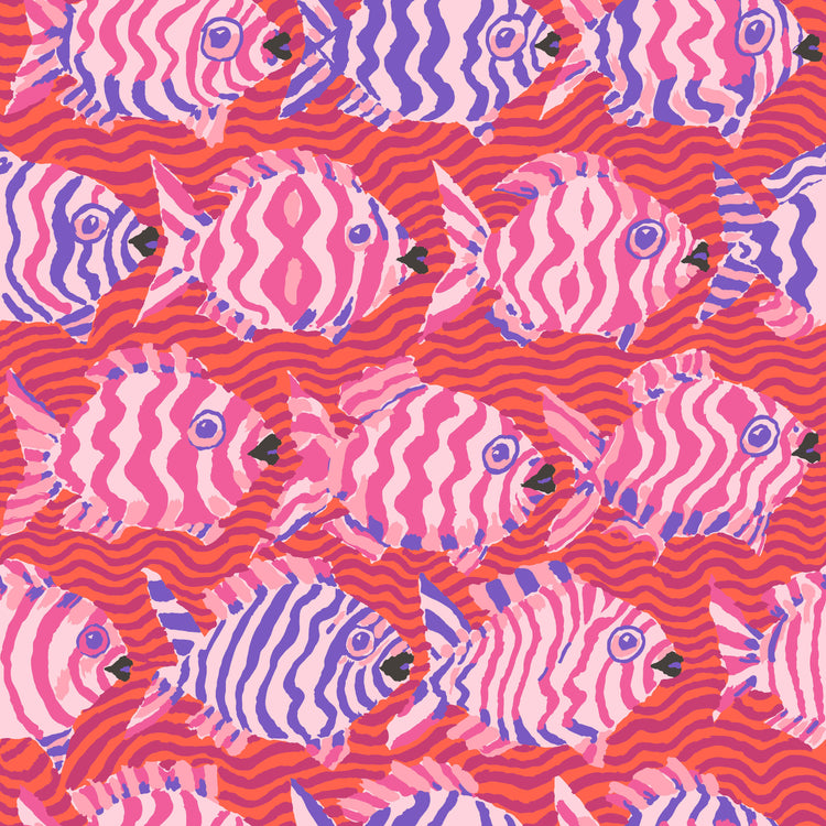 Minnows – Red by Brandon Mably for the Kaffe Fassett Collective is a lively underwater design featuring bold, striped fish in shades of pink, purple, and coral swimming across a wavy red and orange background. The playful mix of color and movement makes this print perfect for standout quilt blocks, seaside-inspired décor, or whimsical apparel projects.