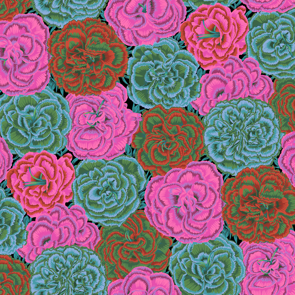 Picotee Carnations – Dark by Philip Jacobs for the Kaffe Fassett Collective bursts with lush blooms in vibrant pink, red, and teal, accented with painterly petal edges for striking detail. The bold florals overlap across a dark ground, creating rich contrast and depth that makes a dramatic statement in quilts, apparel, and home décor.