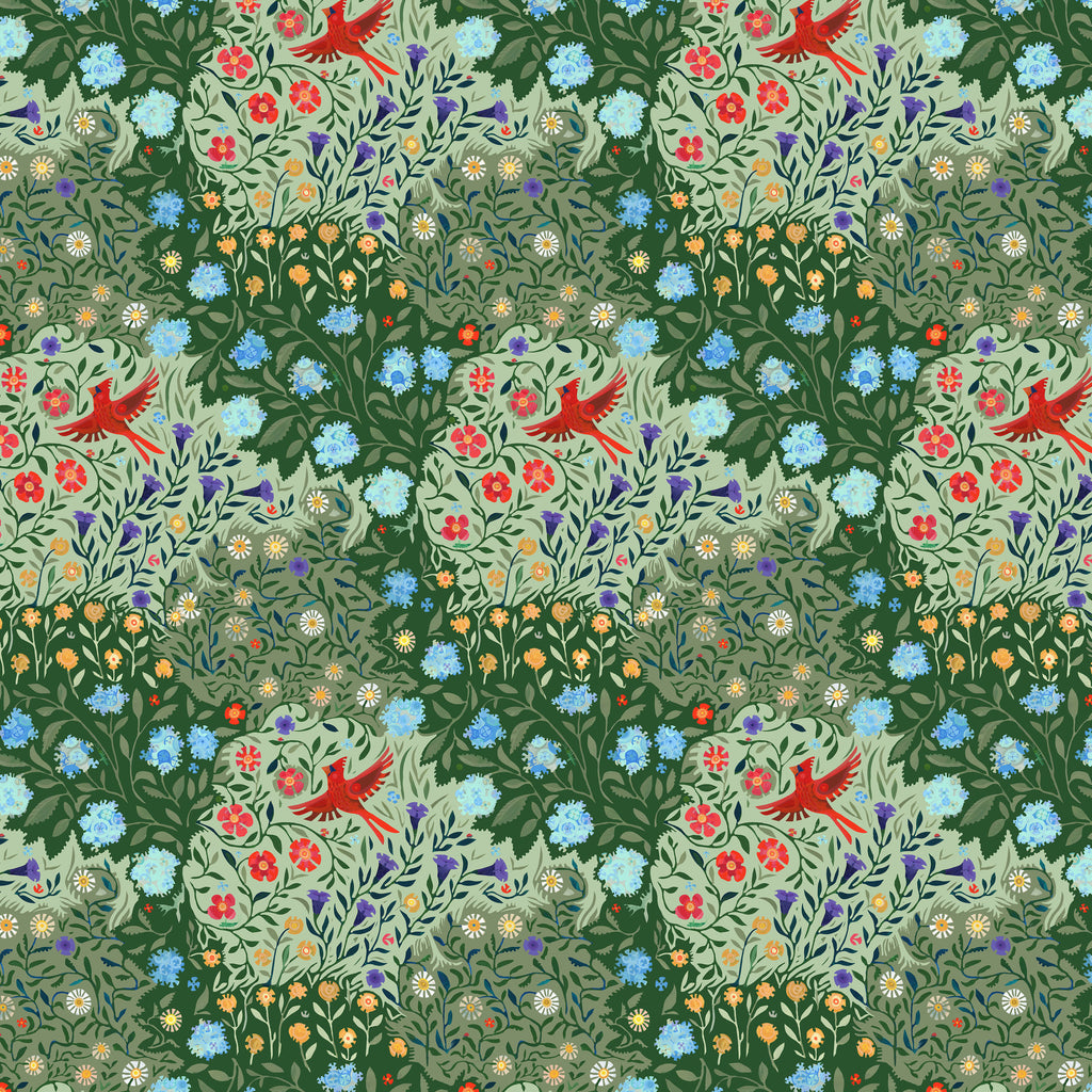A lush, painterly garden scene filled with blooming flowers, leafy branches, and red songbirds in flight. The layered design creates depth and movement, with shades of green, blue, coral, and gold capturing the beauty of a garden at its peak. Elegant yet full of life, this print works beautifully as a feature fabric or to add richness to floral and nature-themed quilts. Printed on 100% quilting cotton, it brings an artful, garden-inspired feel to spring and summer projects.