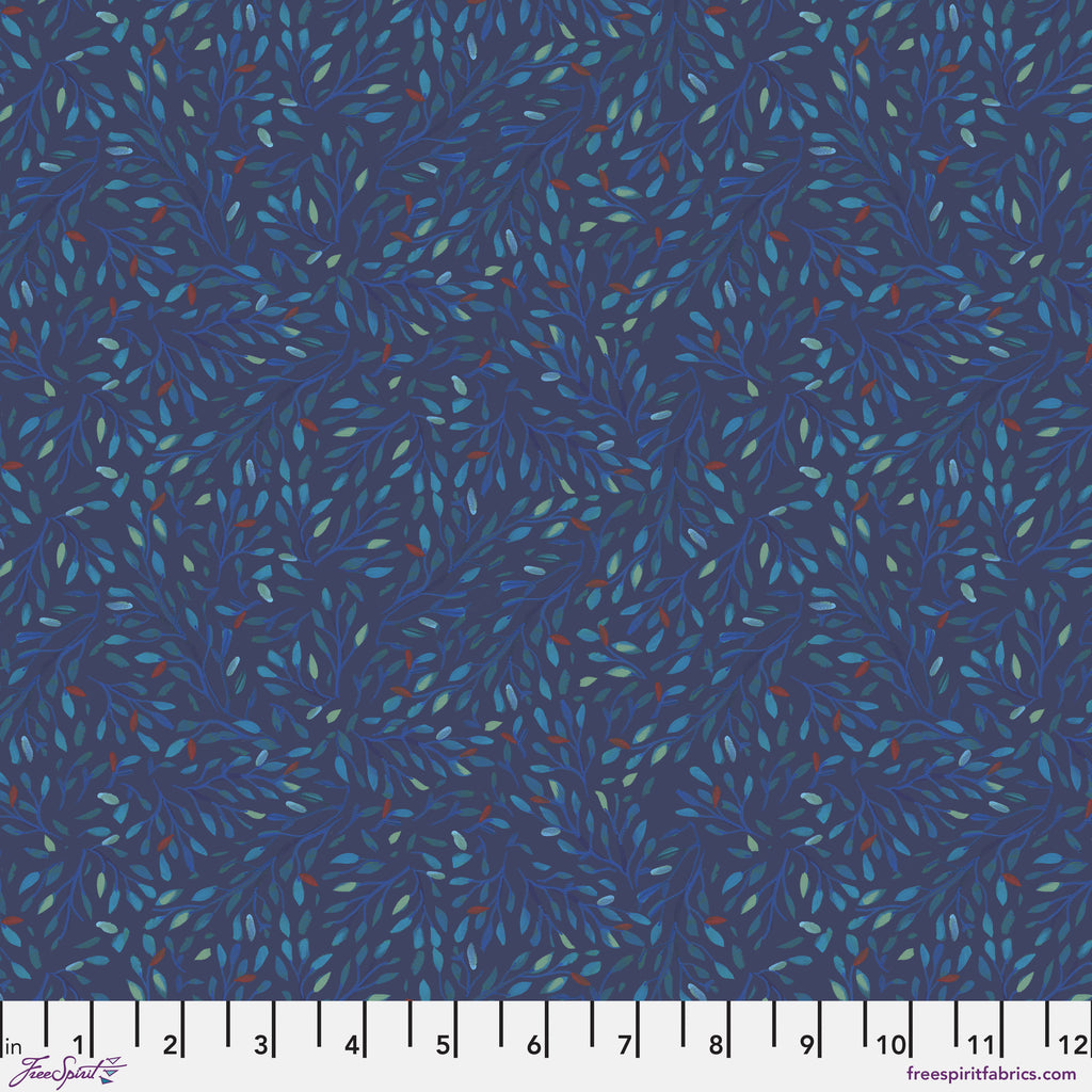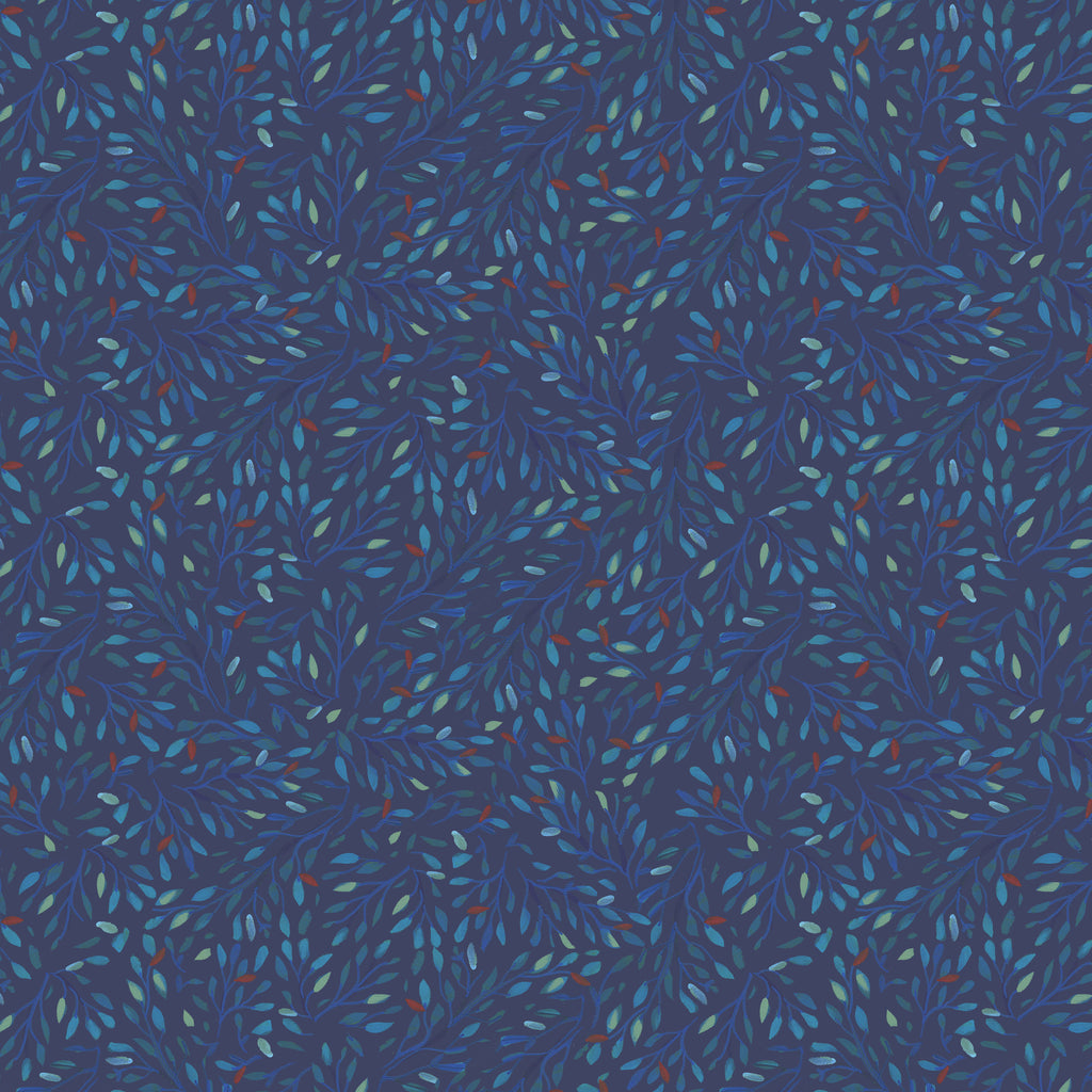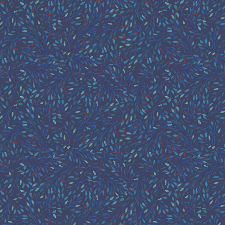 A rich, painterly blender of leafy branches in layered shades of blue, teal, and indigo on a deep navy background. The hand-painted brushstrokes create subtle movement and texture, evoking the quiet beauty of treetops under evening light. Both versatile and elegant, this print pairs easily with florals, botanicals, and nature-inspired designs. Printed on 100% quilting cotton, it’s ideal as a tonal coordinate or as a soft accent in quilts and home décor.