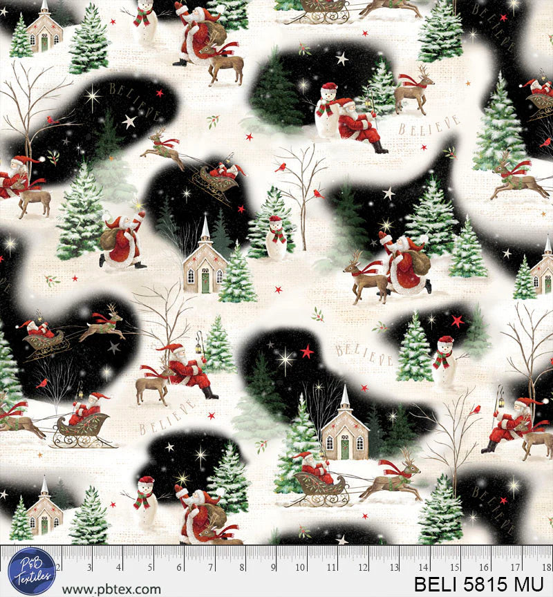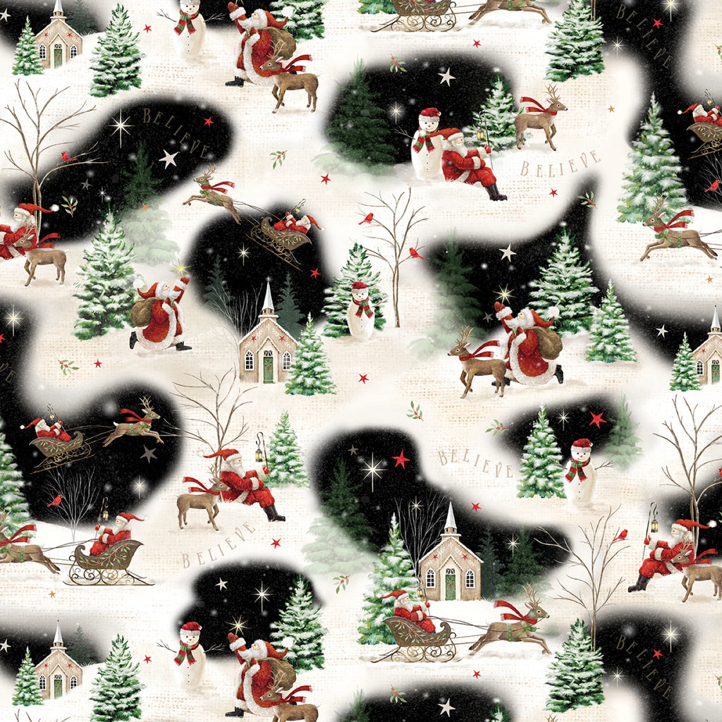 This enchanting fabric design brings the magic of Christmas to life with a charming array of festive scenes. Santa Claus is depicted in various joyful activities, from flying through the night sky with his reindeer to delivering gifts in his sleigh. The backdrop features snowy landscapes with evergreen trees, quaint churches, and starry night skies, all framed by whimsical black vignettes that highlight each festive moment. The word 'Believe' is subtly woven into the design, adding a touch of holiday spirit and encouragement.