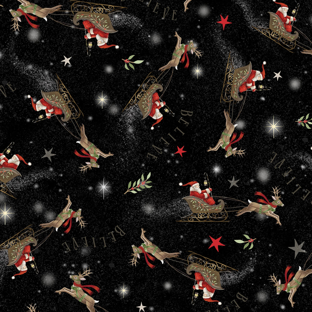 This fabric features a delightful allover print of Santa Claus riding his sleigh, pulled by reindeer, against a starry black background. The design is adorned with red stars, sprigs of greenery, and the word "BELIEVE" scattered throughout, creating a magical Christmas atmosphere. The fabric's rich detailing and vibrant colors make it perfect for holiday-themed crafts, apparel, and home decor projects, bringing a touch of holiday cheer to any creation.