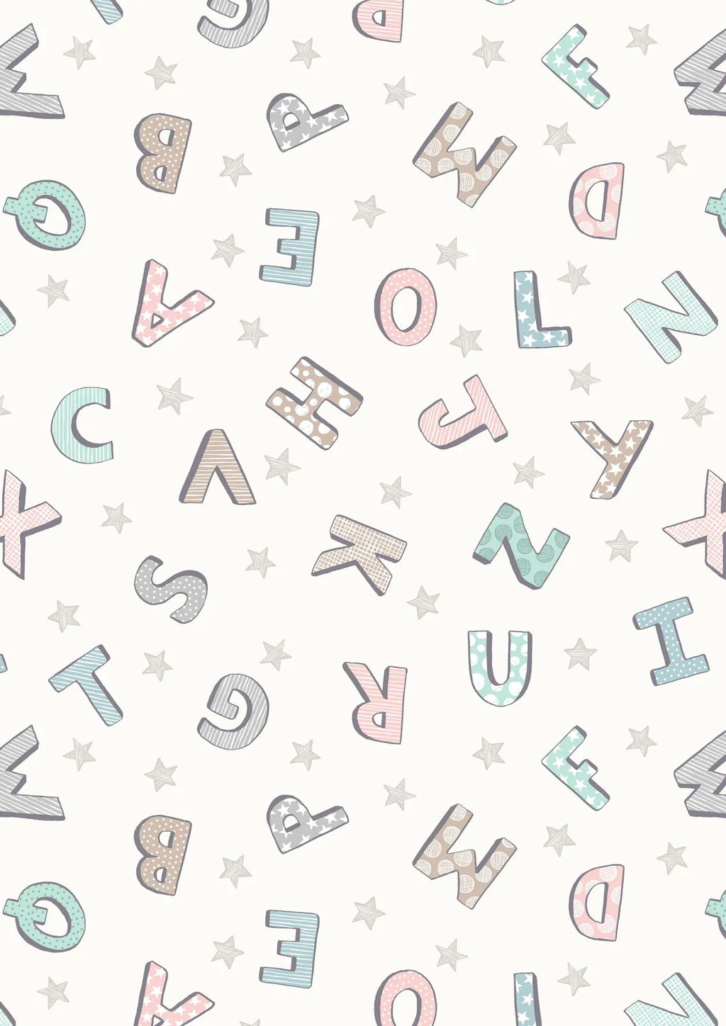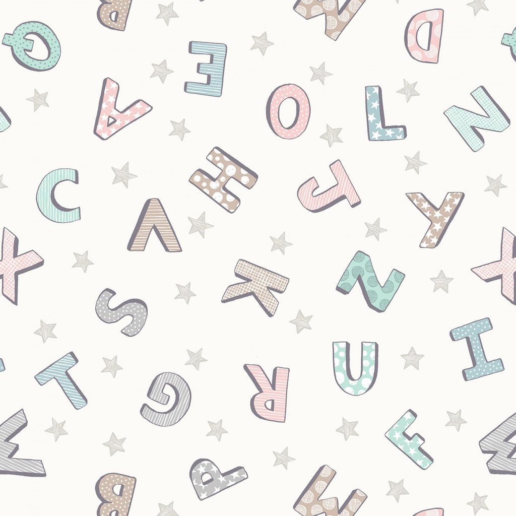 This fabric from the Bella Bunny and Bear collection by Lewis & Irene features a playful alphabet design with each letter decorated in subtle geometric patterns. Tiny stars are scattered between the letters on a creamy white background, creating a sweet and gentle print that’s perfect for nursery quilts, baby accessories, or early learning projects.