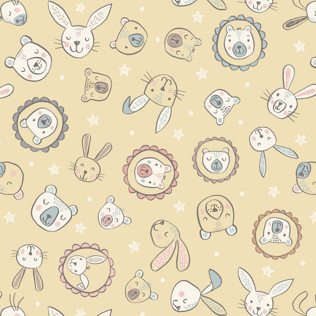 This fabric from the Bella Bunny and Bear collection by Lewis & Irene features a scattered design of Bella the bunny and Bear’s faces, accented with tiny stars and dots on a pale yellow background. Simple and sweet, this playful print works beautifully as a coordinate in nursery quilts or children’s projects.