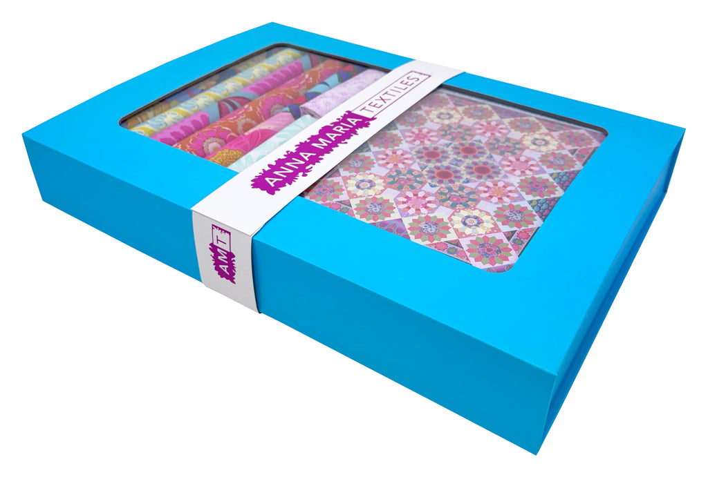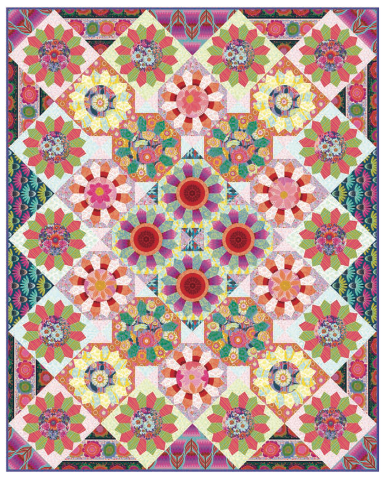 Bespoke Quilt No. 2 is a bold, vibrant quilt design featuring floating Dresden Plate snowball blocks framed by dramatic setting triangles that create movement and visual impact. This curated quilt kit showcases richly layered color and modern florals from Anna Maria's Indelible Soft, Jumpstart, and Perennial Borders collections, creating a striking heirloom-style quilt with a contemporary feel. The finished size makes it perfect as a large throw or bed quilt, and the included templates help ensure precise, confident piecing.