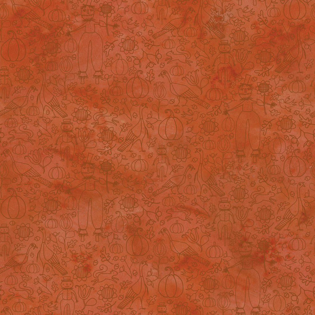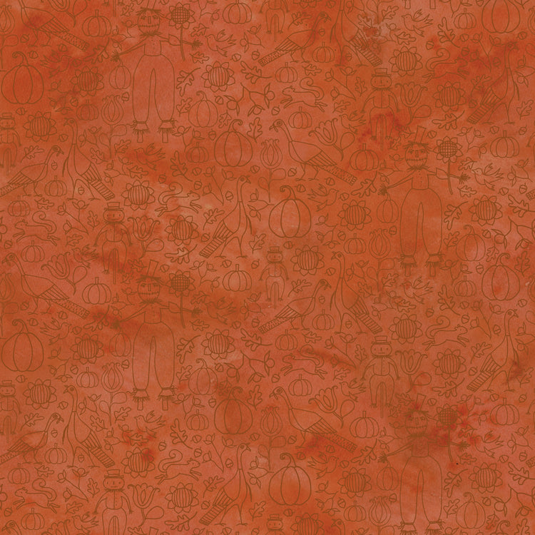 This print features line-drawn fall icons, such as pumpkins, turkeys, sunflowers, acorns, and scarecrows, on a textured background.