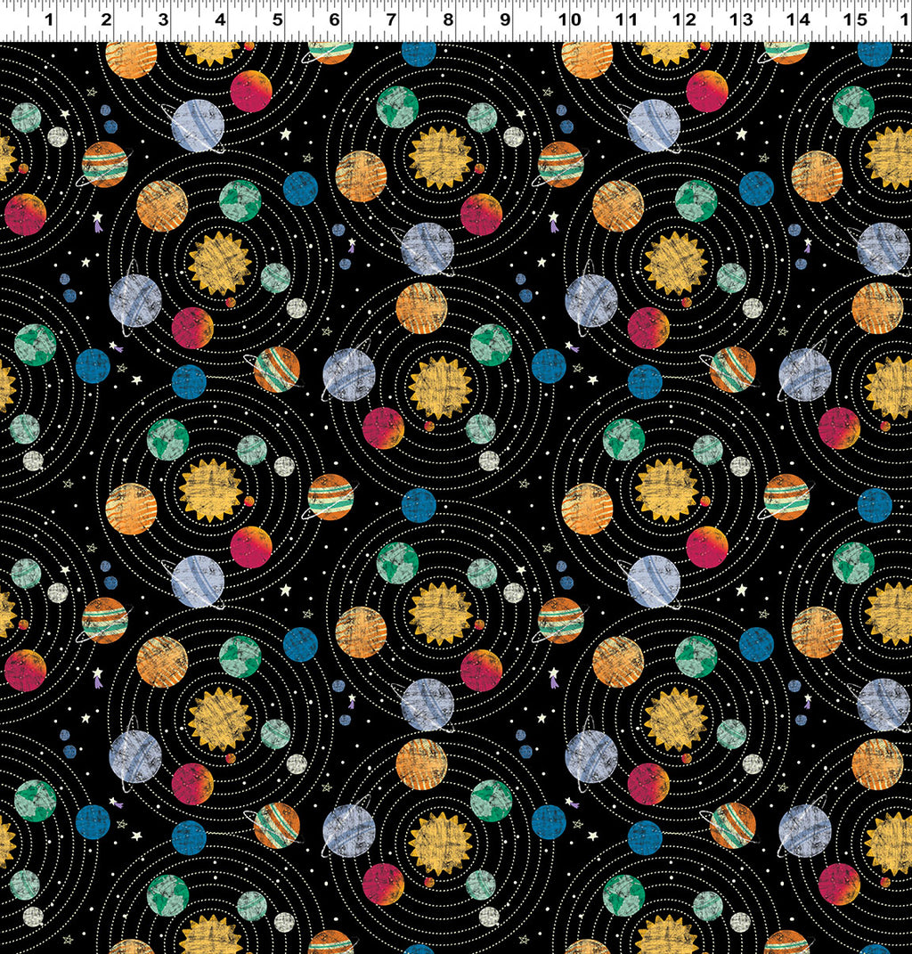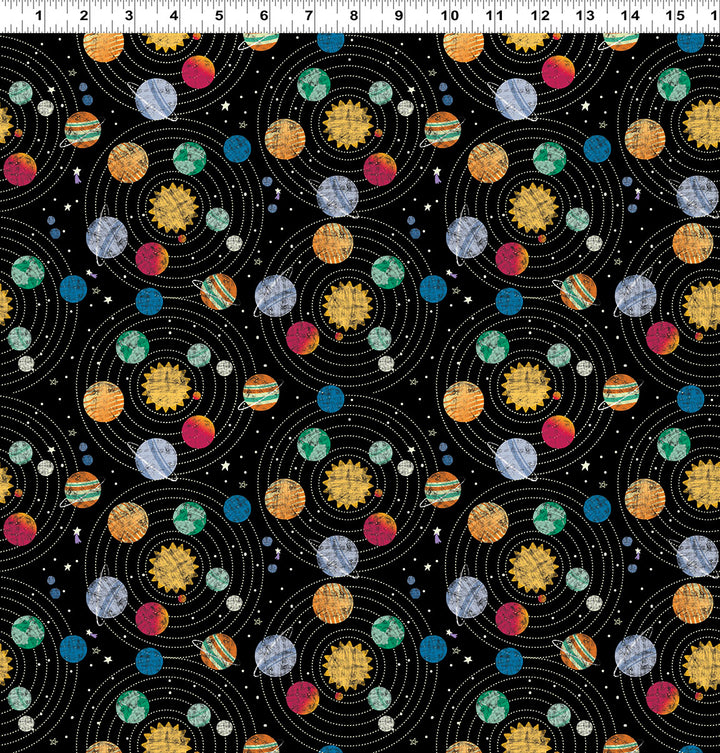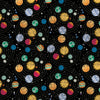 This vibrant fabric features a cosmic design with a repeating pattern of planets and suns, each surrounded by orbiting paths. The planets are depicted in various colors including blue, red, green, and orange, set against a deep black background that mimics the vastness of space. The design is both educational and visually stimulating, perfect for projects that aim to capture the wonder of the universe.
