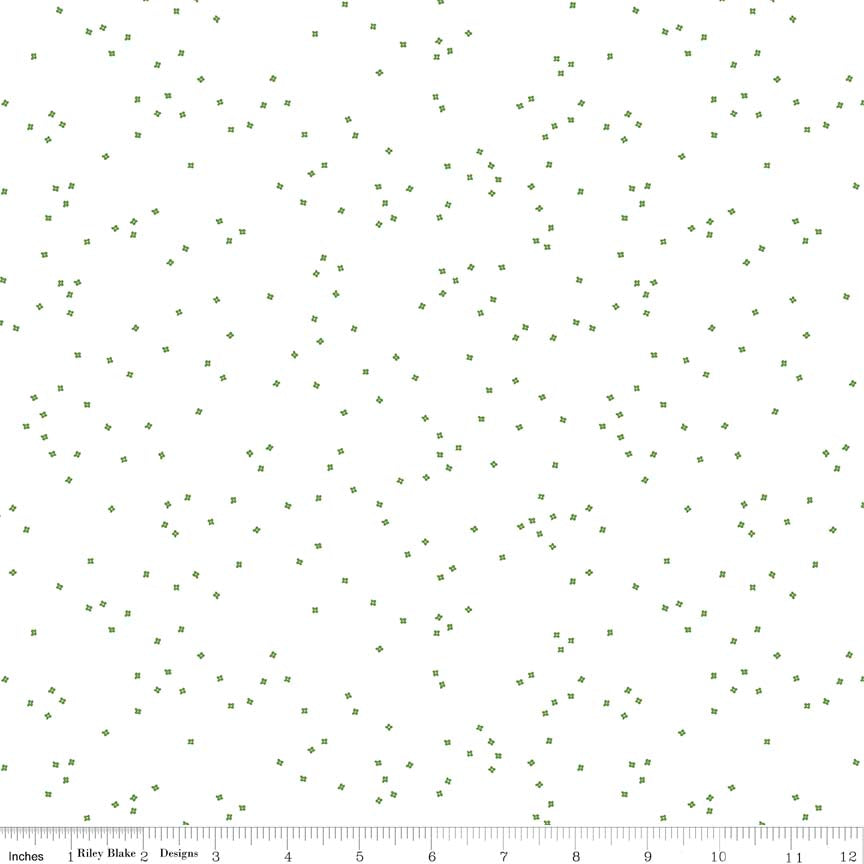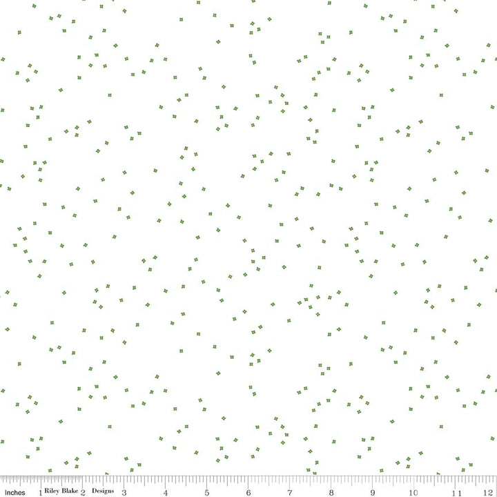This fabric features tiny green blossoms on a solid white background. Printed on 100% quilting cotton. Machine wash cold / tumble dry low.