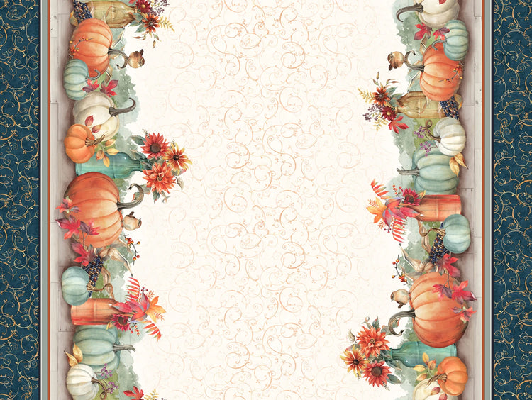 This fabric features a charming double border design with a harvest theme, showcasing an array of pumpkins in vibrant autumn hues like orange, red, and green, interspersed with fall flowers and foliage. The borders are set against a light background with a subtle, elegant swirl pattern, creating a perfect balance between the detailed borders and the simplicity of the central design. The rich, detailed imagery evokes a warm, seasonal feel, ideal for projects that celebrate the fall season.