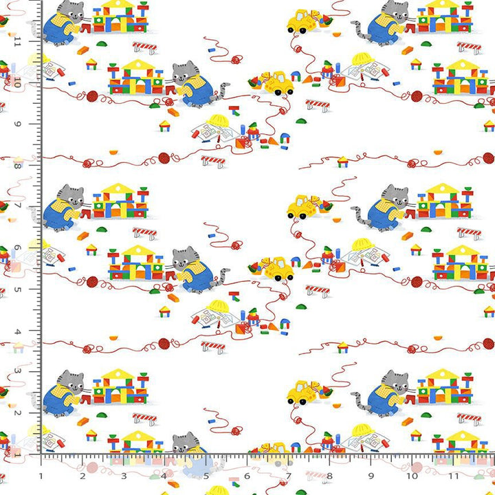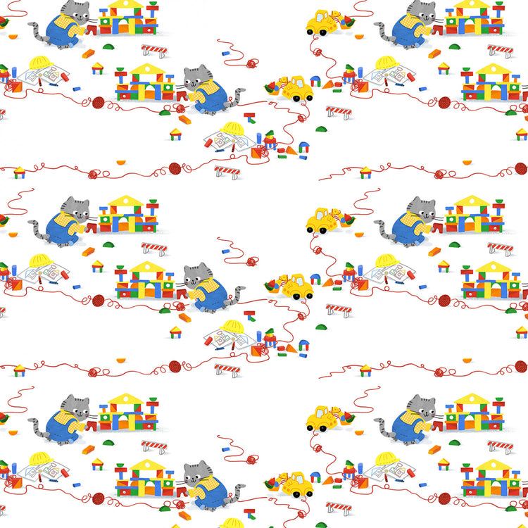 This delightful fabric features a playful design of kittens engaged in construction play with colorful building blocks and toy vehicles. The kittens, dressed in overalls, are scattered across the white background, creating a charming and whimsical scene perfect for children's projects or anyone who loves cute, playful themes. The design is detailed with red strings connecting the blocks, adding a dynamic and engaging element to the fabric.