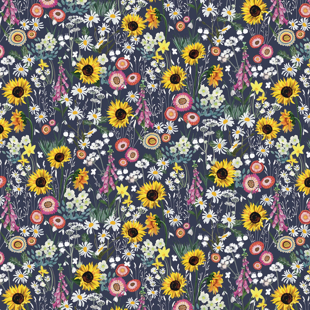 This 100% cotton print bursts with vibrant florals including sunflowers, daisies, foxgloves, and more, set against a deep navy background. The mix of bright yellows, pinks, reds, and whites creates a lively contrast that makes this fabric shine as a feature print. Its painterly detail and rich palette bring a natural energy that’s perfect for quilts, bags, and bold home décor accents.