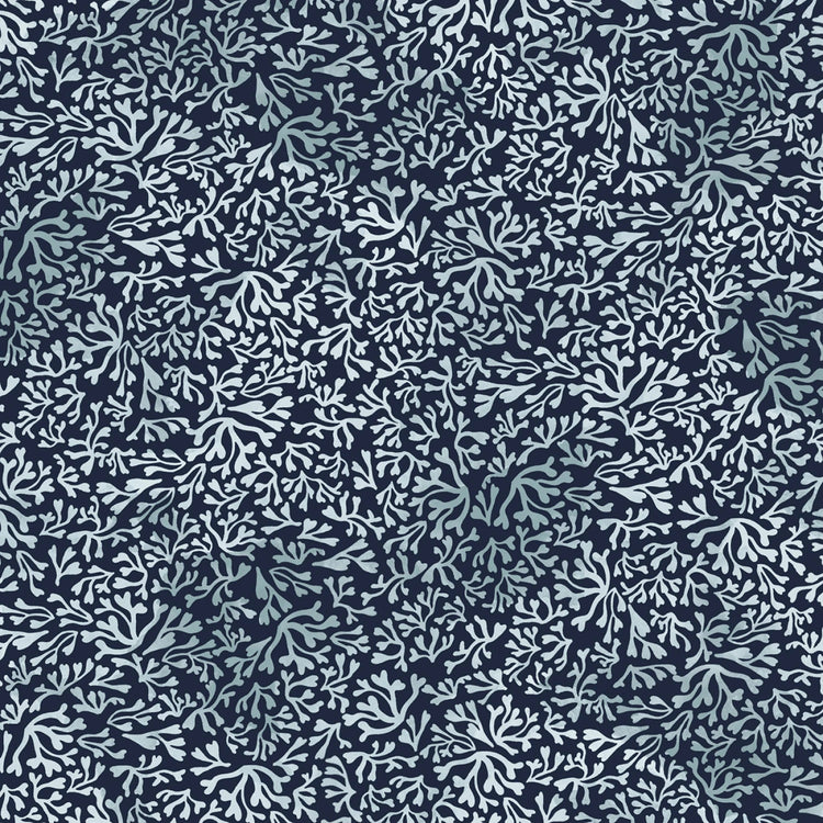 This 100% cotton print features branching motifs in soft teal-gray tones layered over a deep navy background. The design feels both botanical and aquatic, with a look that hints at coral drifting beneath the sea or dense foliage silhouetted against the night. Its rich contrast makes it a striking choice for adding texture and depth, while still versatile enough to function as a tonal in quilting projects.
