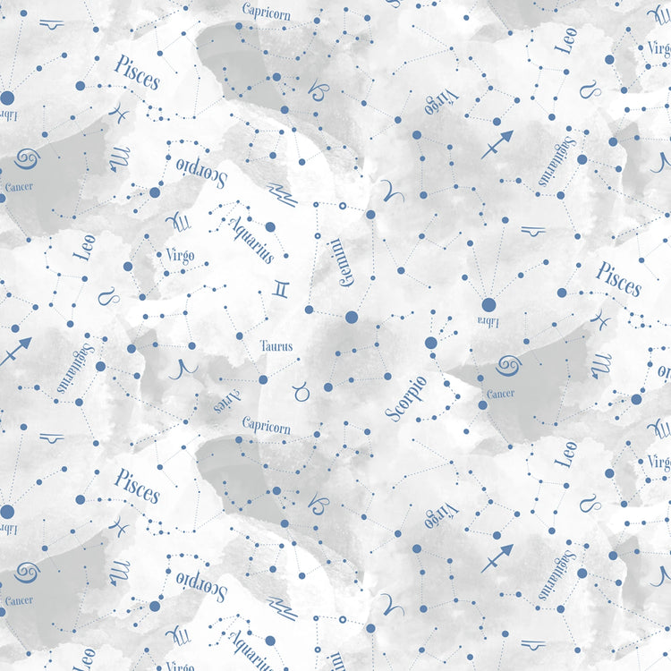 This 100% cotton print features a pale watercolor-style background accented with blue zodiac constellations, names, and astrological symbols. The scattered stars and dotted constellation lines give it a celestial, dreamlike quality, while the lighter colorway makes it especially versatile as a blender or background. It combines textural softness with cosmic detail, ideal for adding subtle interest without overwhelming a project.