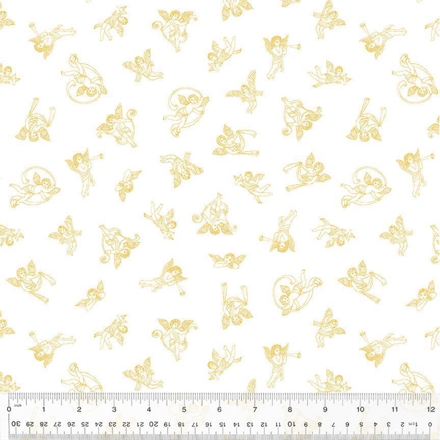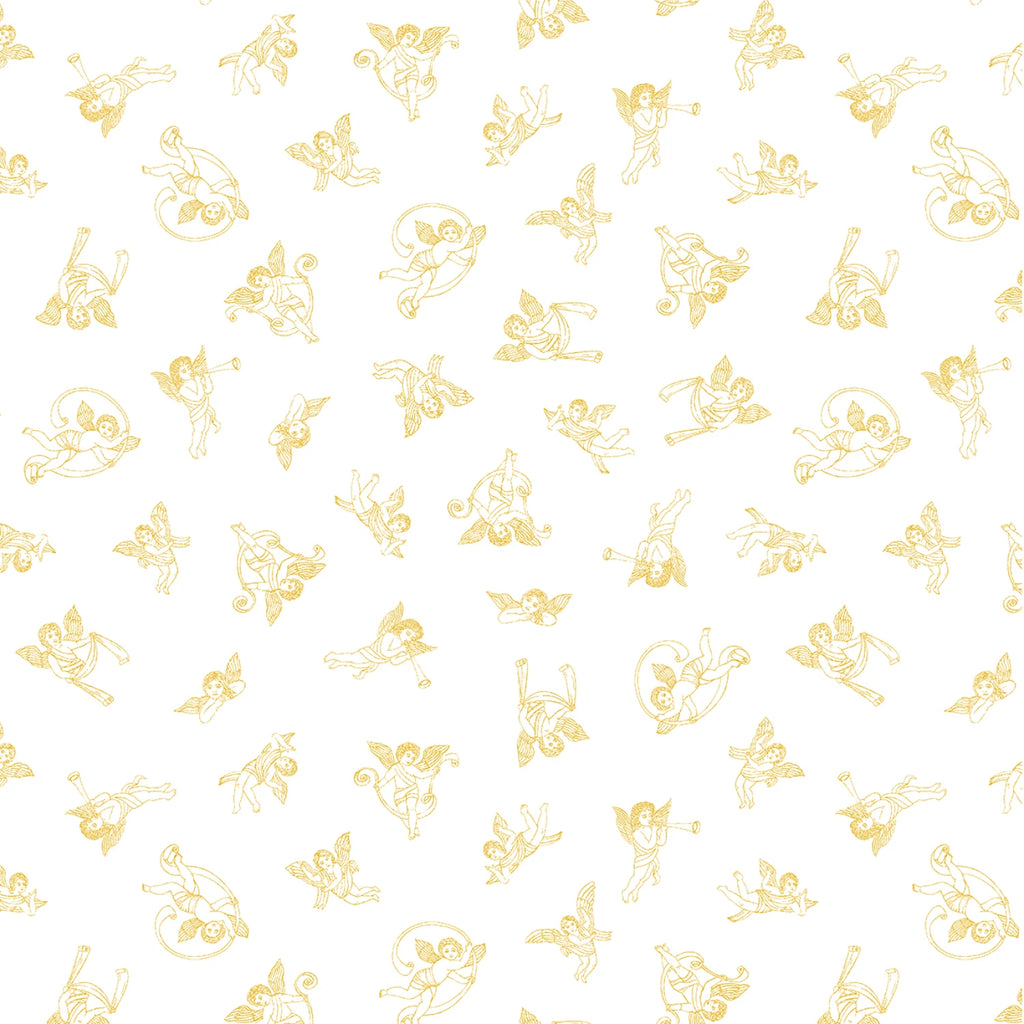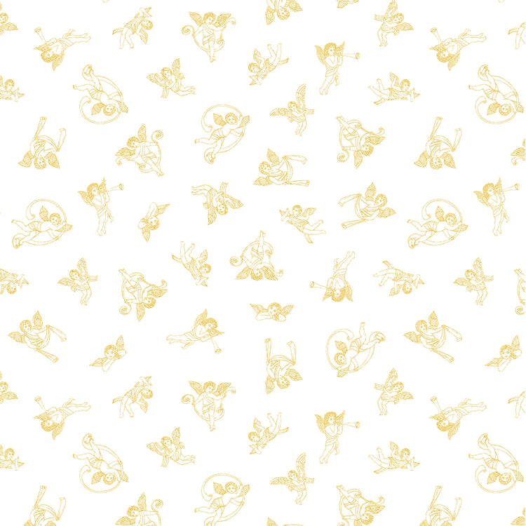 This fabric features a delicate pattern of golden angels in various playful poses, set against a pristine white background. The design evokes a sense of ethereal beauty and whimsy, perfect for creating unique garments or home decor items that stand out with their angelic charm. This fabric's soft cotton texture ensures comfort and durability, making it a versatile choice for a wide range of projects.