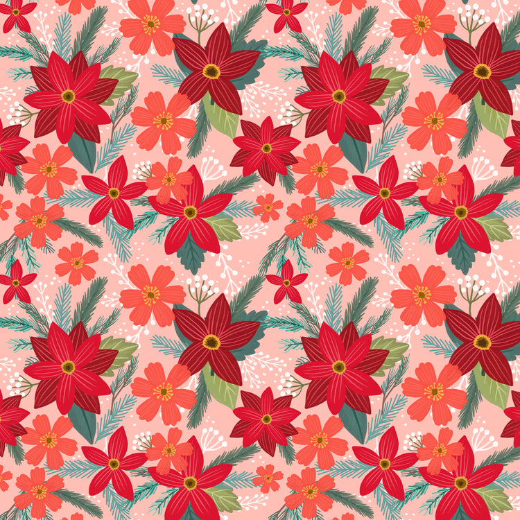 Clusters of bold red poinsettias and delicate winter greenery burst across a soft rose-pink background in this joyful holiday floral. Great for feminine, festive quilts or as a warm, vibrant blender.