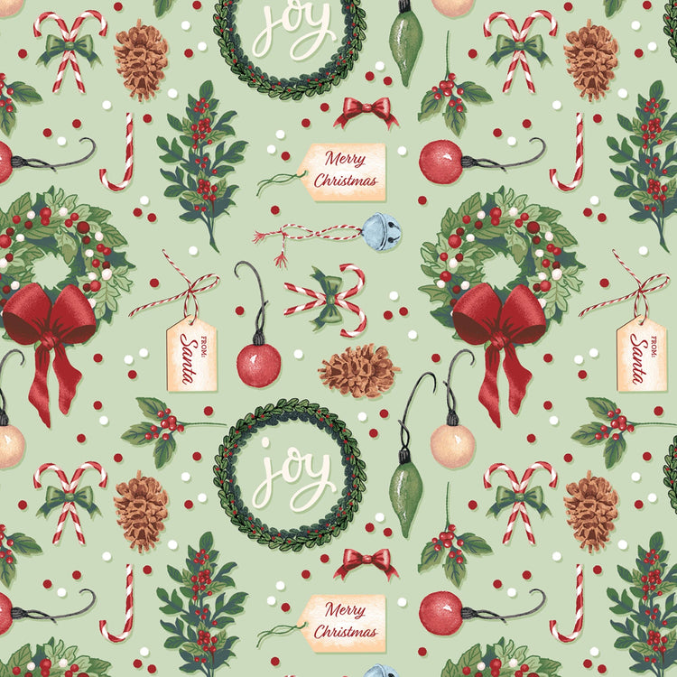 This 100% cotton print is filled with charming Christmas motifs scattered across a soft green background — wreaths, holly, ornaments, pinecones, candy canes, and festive tags. The playful, all-over design makes it perfect for quilts, stockings, table runners, and holiday décor, adding a lively, classic Christmas touch to any project.