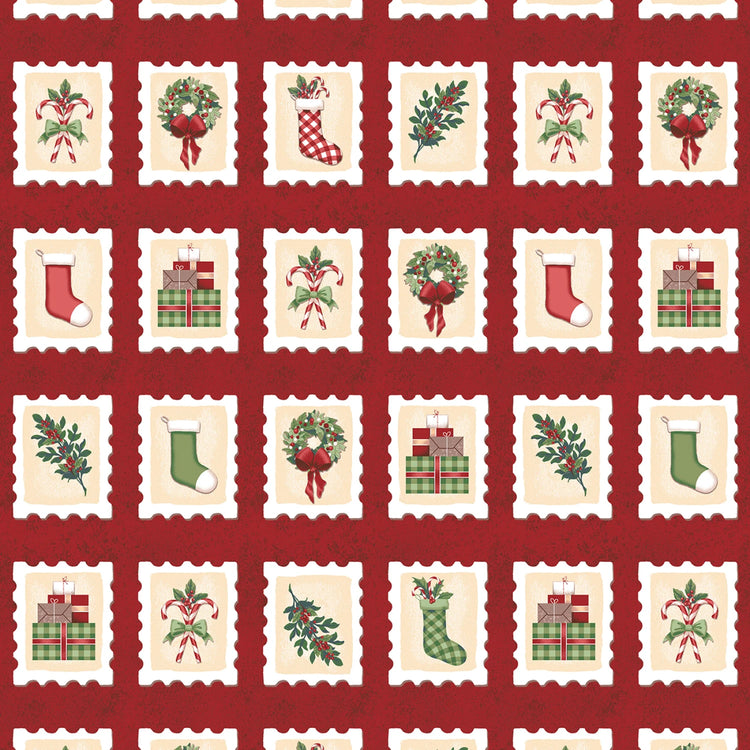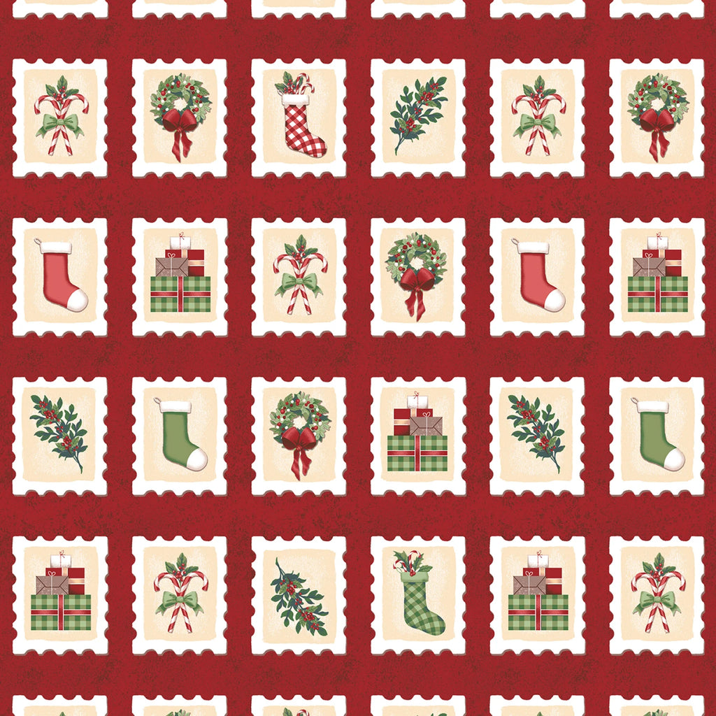 This 100% cotton print features a grid of festive Christmas “stamp” blocks, showcasing stockings, wreaths, gifts, holly, and candy canes on a rich red background. The neatly arranged blocks make it perfect for fussy cutting, block-based quilts, or small holiday projects like ornaments, tags, or appliqué.