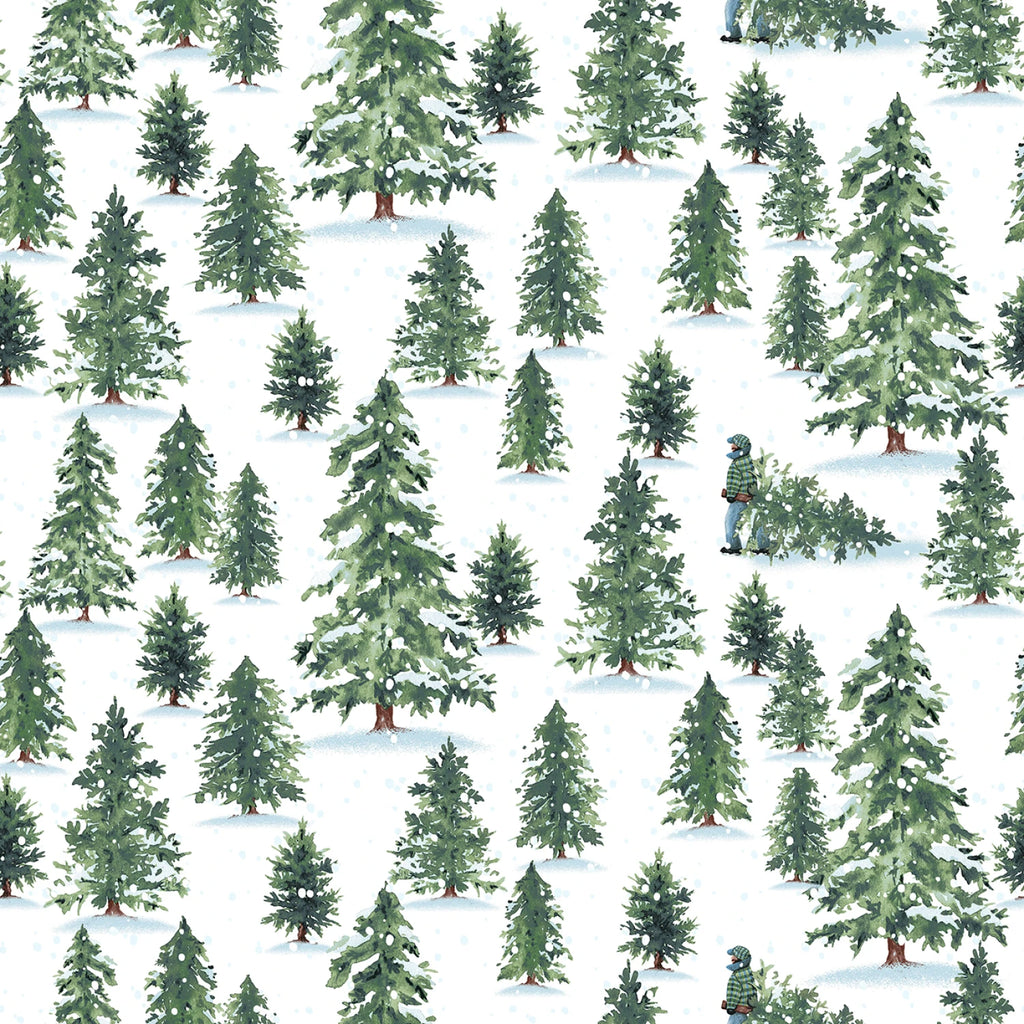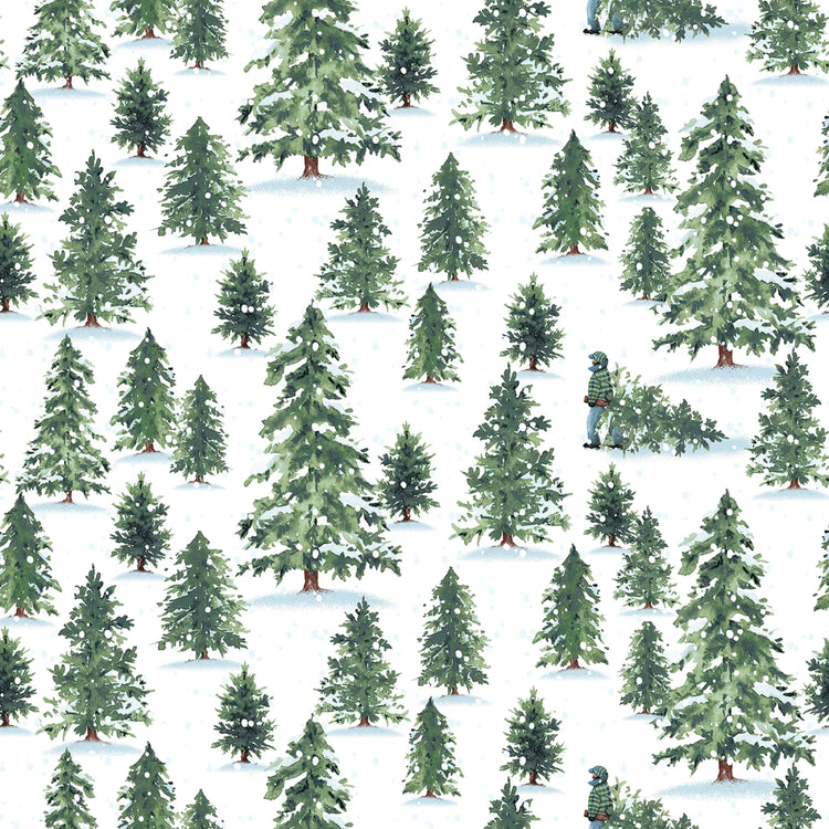 This 100% cotton print features a serene winter forest with snow-covered evergreens scattered across a white background. A subtle detail of a figure carrying a freshly cut Christmas tree adds a nostalgic holiday touch without overpowering the design. Perfect for quilts, borders, or seasonal décor, this versatile print also works beautifully as a scenic blender in holiday projects.