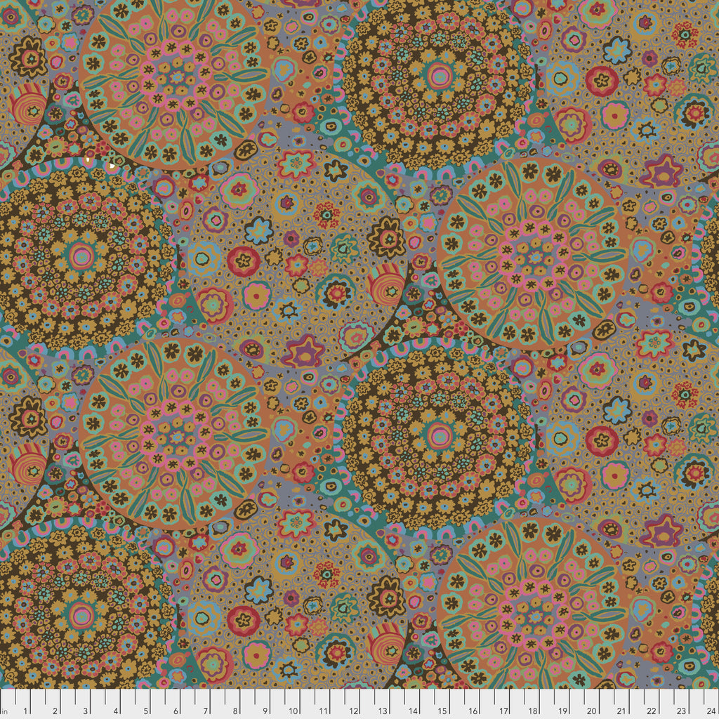 Millefiore – Antique by Kaffe Fassett for FreeSpirit features intricate circular floral motifs layered across a warm, antique-inspired palette. Earthy golds and browns are accented with teal, turquoise, coral, and soft pinks, creating depth and visual movement without feeling overly busy. The dense allover design works beautifully for quilt tops, borders, and statement pieces, and pairs easily with other Kaffe Fassett prints. Printed on 100% quilting cotton.