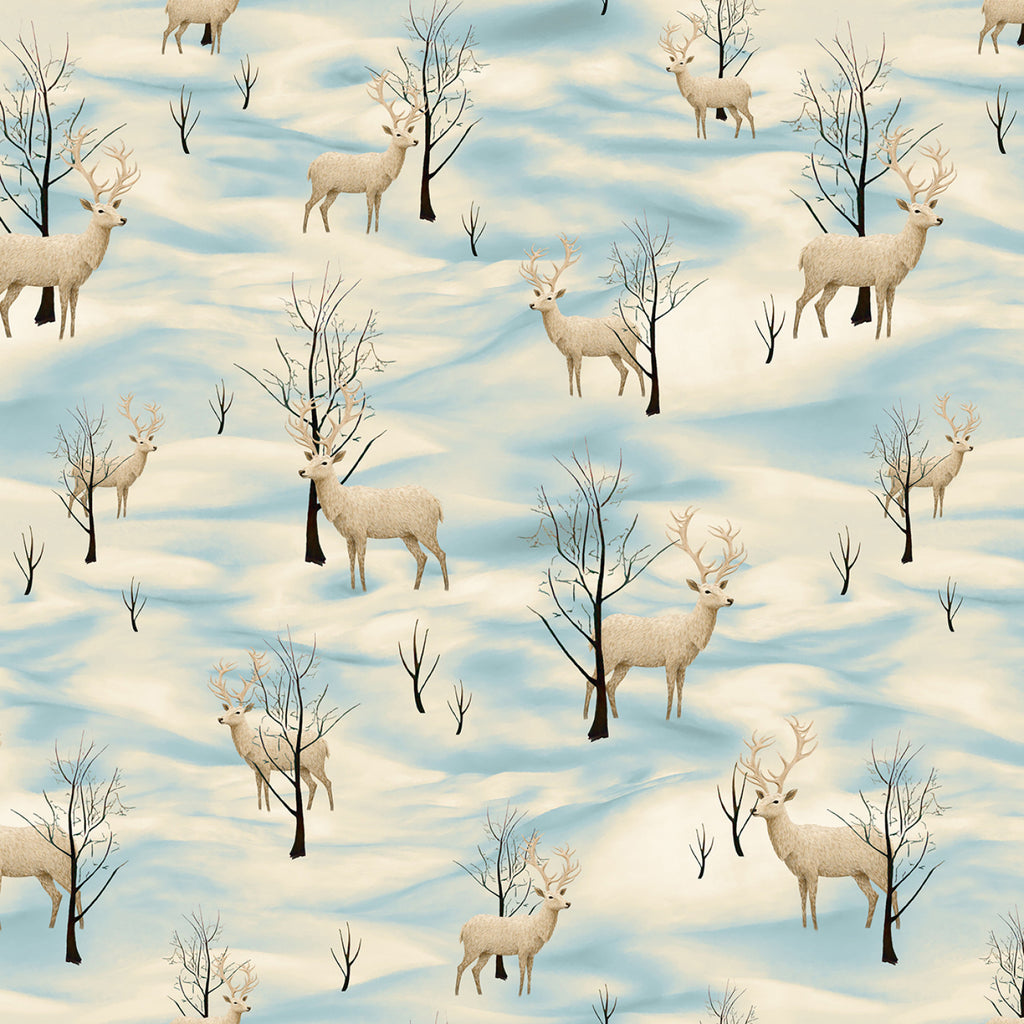 This enchanting fabric features a serene winter landscape with elegant deer and bare trees set against a soft blue snowy background. The design captures the quiet beauty of a winter scene, with deer gracefully scattered across the fabric, creating a peaceful and picturesque pattern ideal for crafting cozy quilts, festive decorations, or stylish apparel.