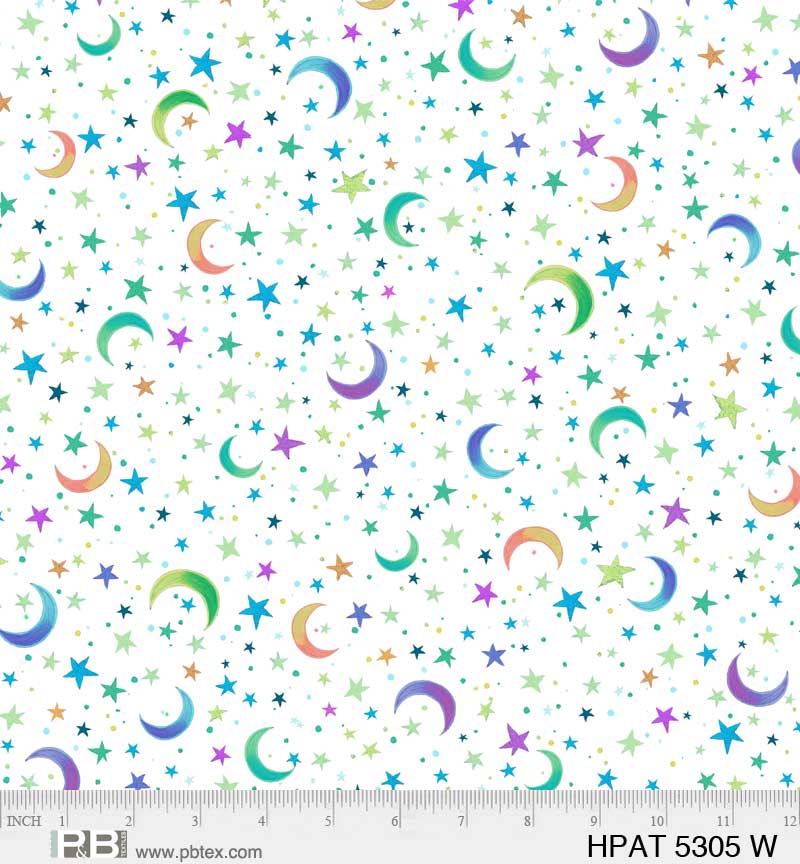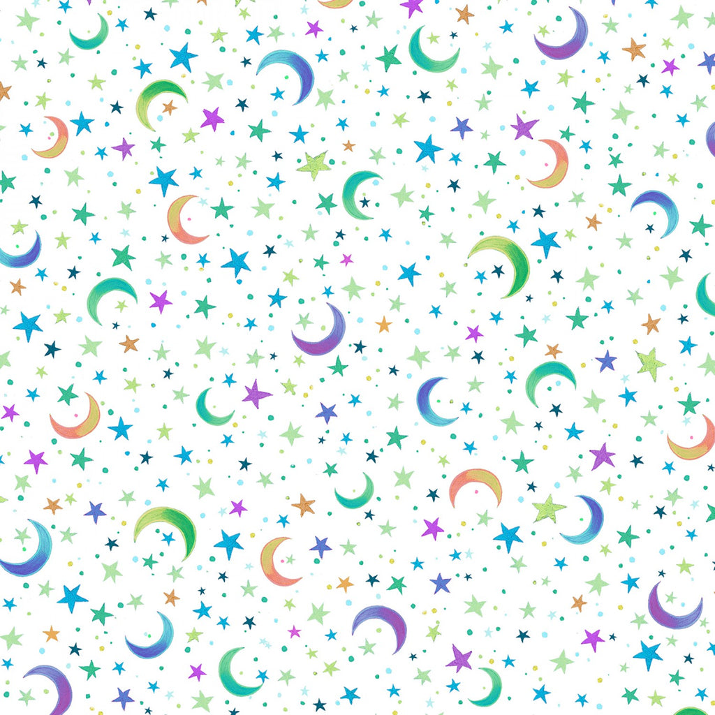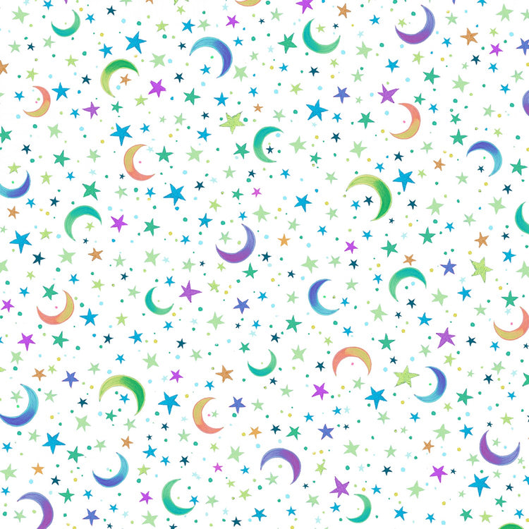 This print features multicolored tossed moons & stars on a white background. 100% Cotton. 44" wide.