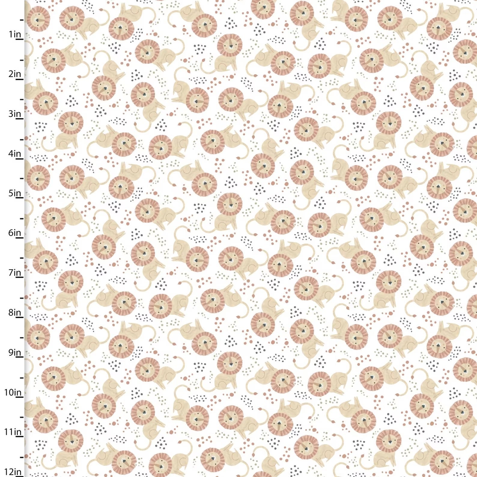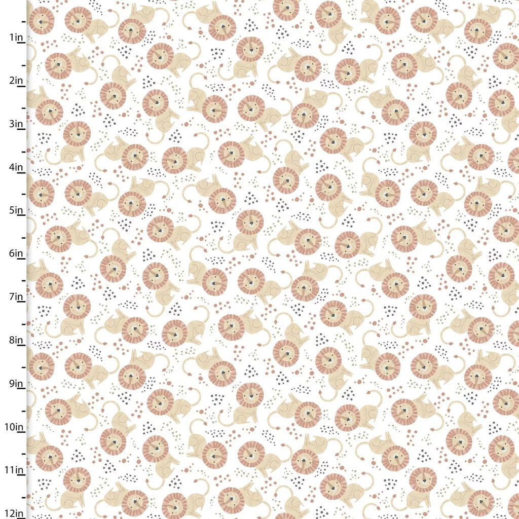 “Lions and tigers and toucans…oh my!” Sweet Savanna by Elaine Kay for 3 Wishes is a 5-piece collection where you will find a mix of safari and jungle animals set against a neutral color palette of blues, grays, and blush. This cotton print features scattered lions on a white background.