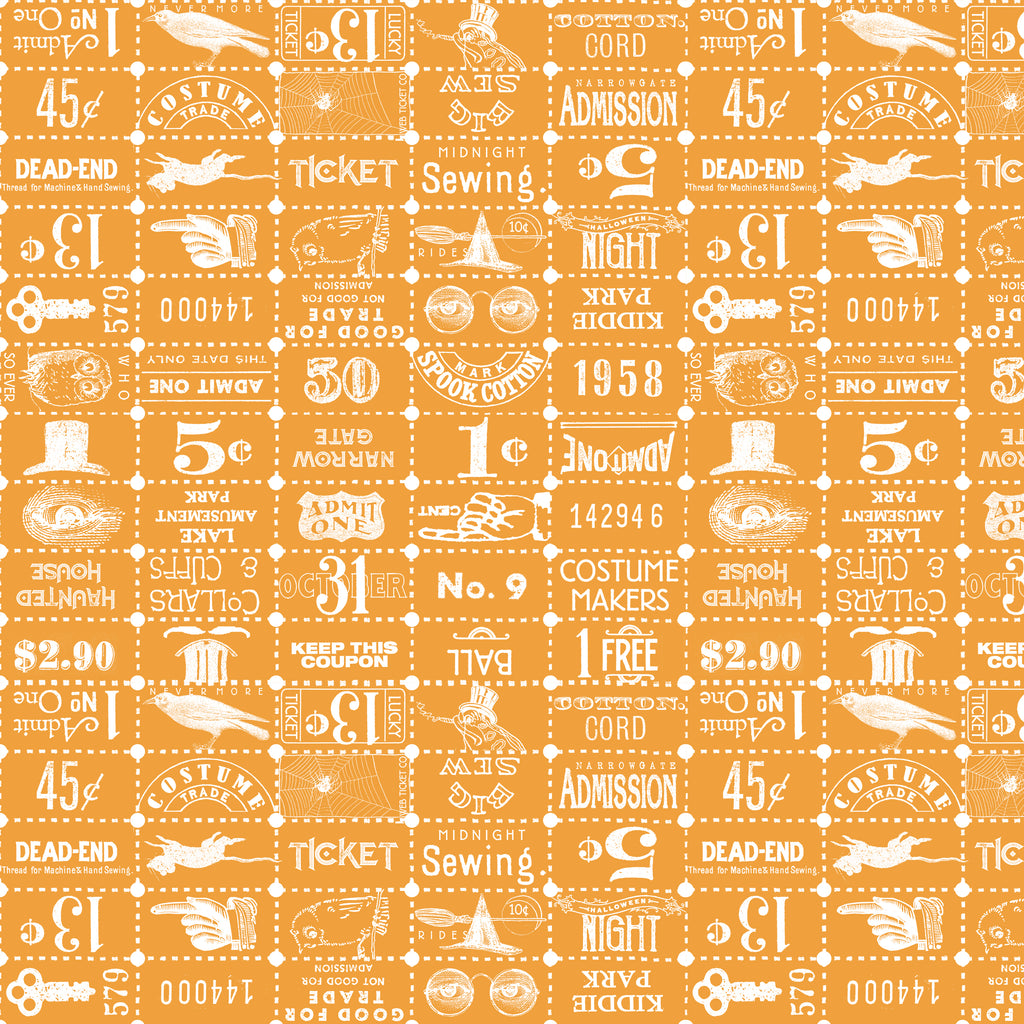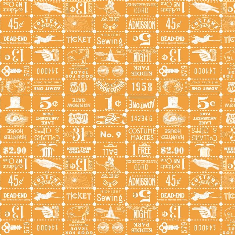 This vibrant fabric features a playful and theatrical design with a repeating pattern of orange tickets, sewing notions, and costume-related icons such as hats, scissors, and spools of thread. The design evokes the charm of a vintage costume shop, making it perfect for projects that require a touch of whimsy and nostalgia. Ideal for costumes, theatrical backdrops, or any creative sewing endeavor, this fabric brings a lively and engaging visual appeal.