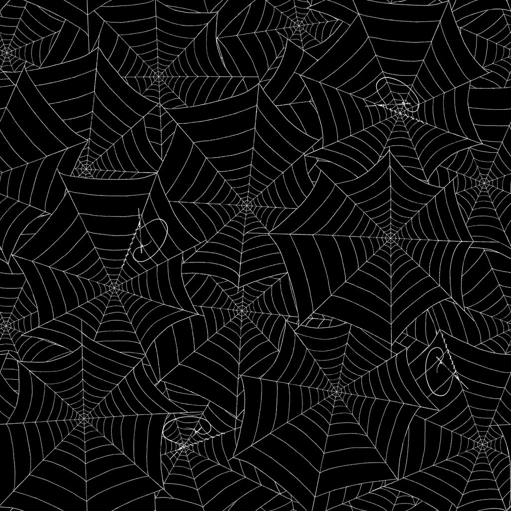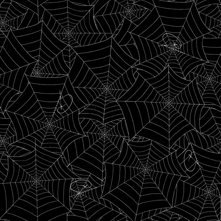 This fabric features delicate white spiderwebs spun across a deep black background—with a twist. Look closely and you'll see small sewing needles "stitching" the web like thread, blending themes of stitching and spookiness. With its gothic elegance and clever design, this fabric is perfect for Halloween quilts, costumes, decor, or any project that celebrates the art of making with a dark vintage flair.