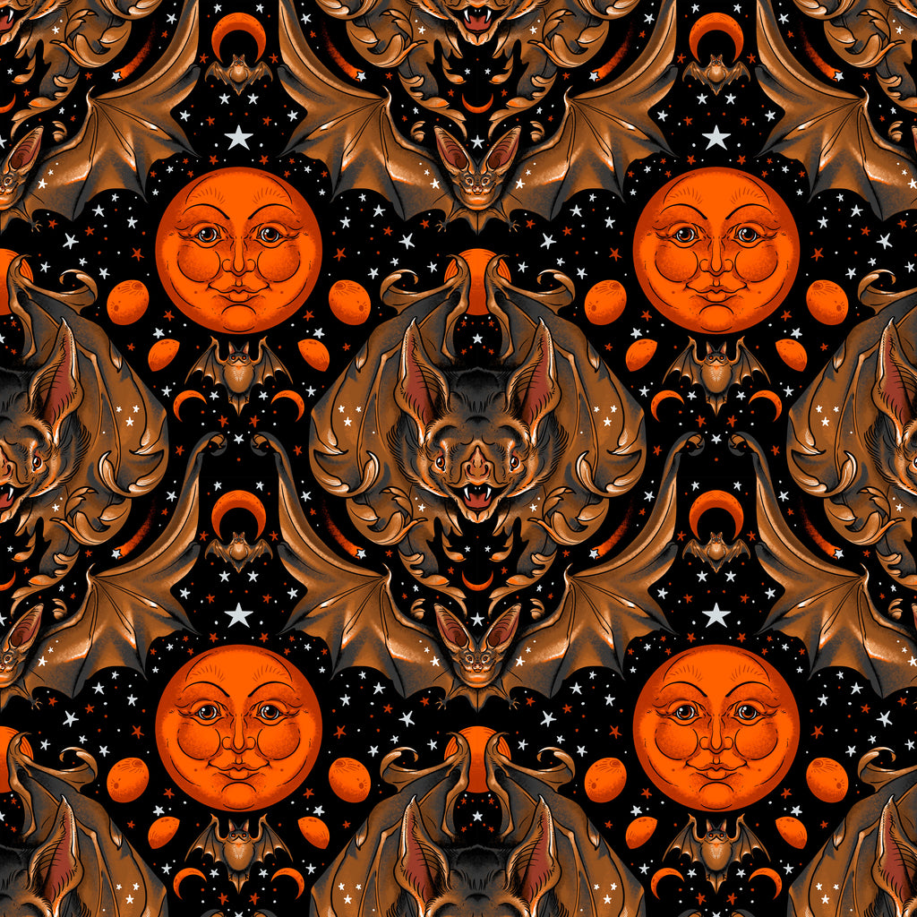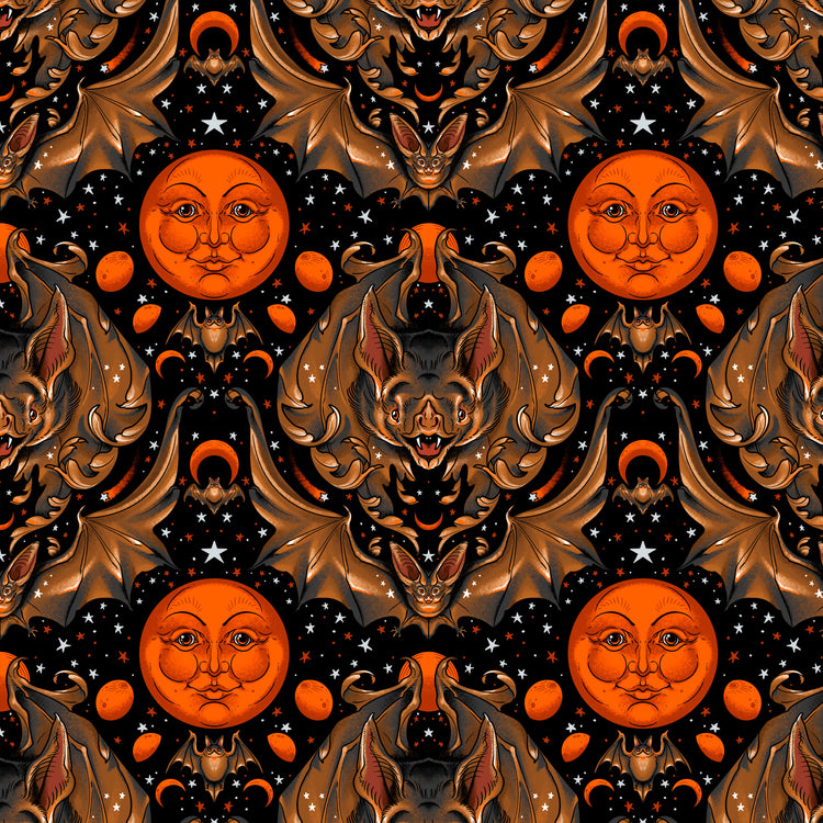 A richly illustrated print featuring wide-winged bats, expressive orange moons, and celestial details that swirl across a black sky. The ornate layout and glowing palette give this fabric an antique, almost mystical vibe. Stunning as a focal print for quilts, wall hangings, or statement decor.