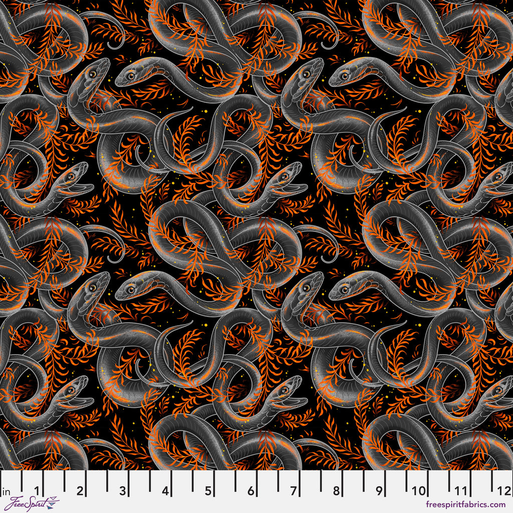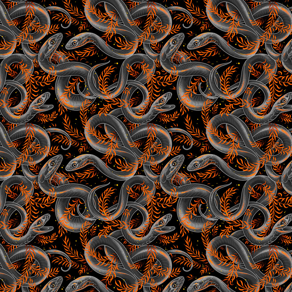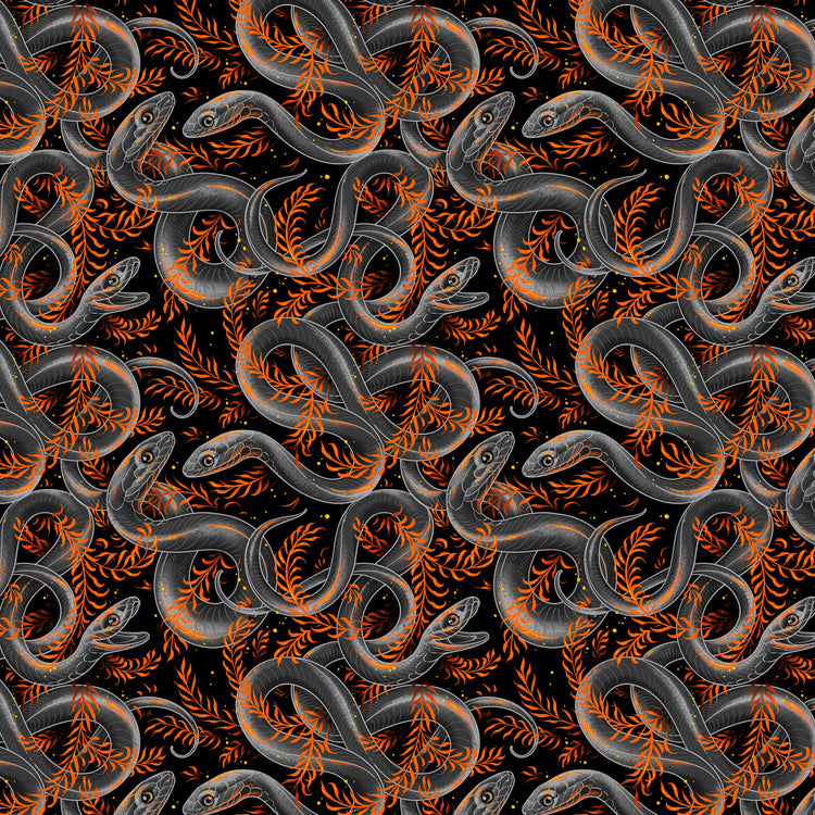 Black and gray snakes coil through a dense tangle of curling orange vines in this moody, mesmerizing print. There’s a subtle shimmer in the linework that gives the snakes a lifelike gloss, perfect for adding an edgy, witchy vibe to Halloween projects.