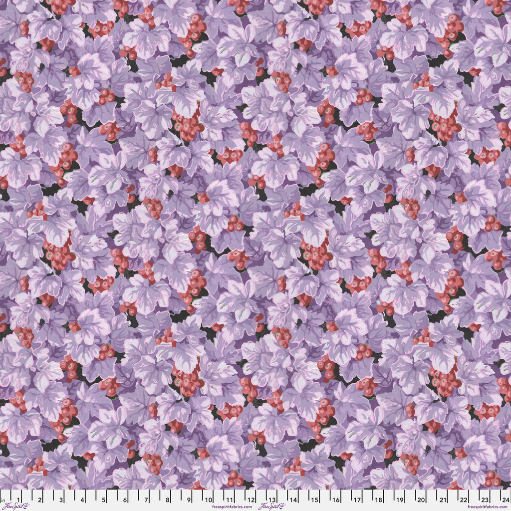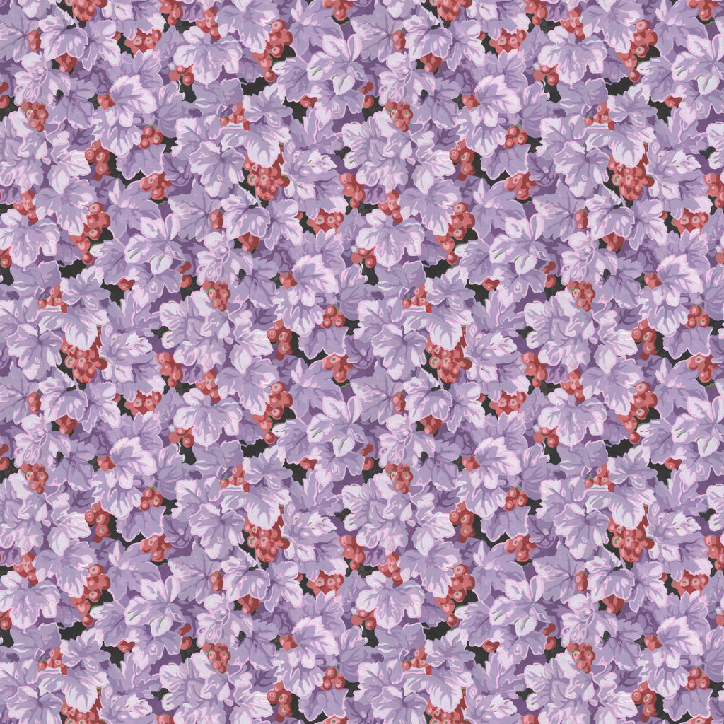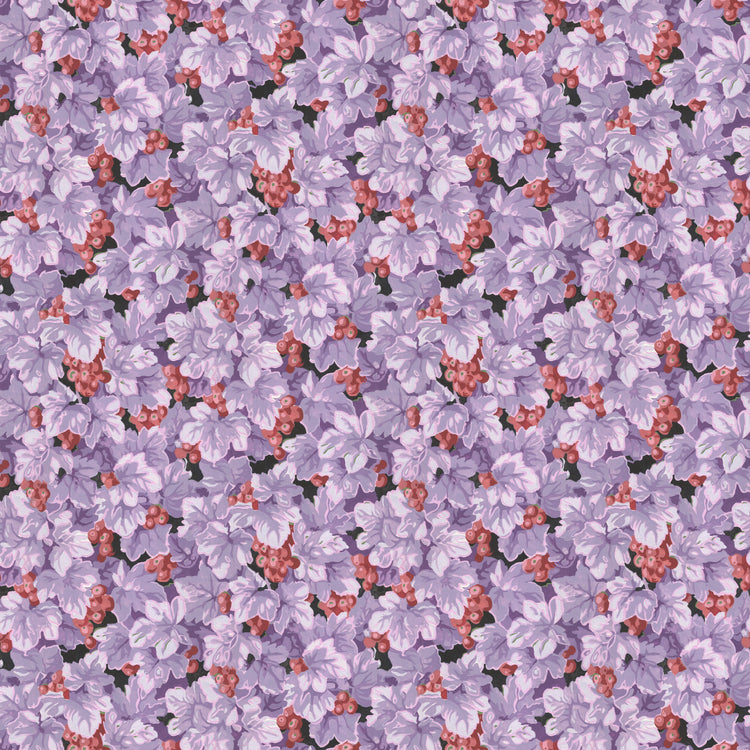 This fabric from Snow Leopard Designs features richly layered purple grape leaves accented with clusters of red and pink grapes. The detailed, flowing design creates a sense of movement and depth, perfect for adding lush color and artistry to quilts, home décor, and creative projects.