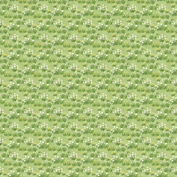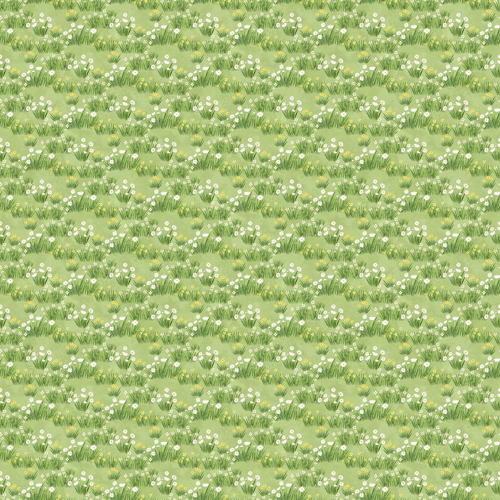 Daisies and small yellow blooms scatter through soft green grass for a gentle meadow feel. Printed on 100% quilting cotton and illustrated by Deborah Edwards, this is a light, natural coordinate that adds a fresh, outdoor softness to quilt layouts.