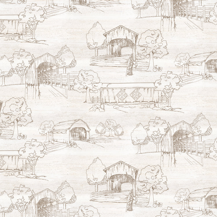 This 108" wide backing fabric by Tara Reed for Riley Blake Designs features finely sketched covered bridges and leafy trees on a soft white background, accented with a few understated bicycle details. The gentle sepia linework and light tonal palette give this fabric a timeless, airy feel. Its quiet design makes it an excellent choice for low volume or background use, adding soft texture without distracting from your quilt’s main fabrics.