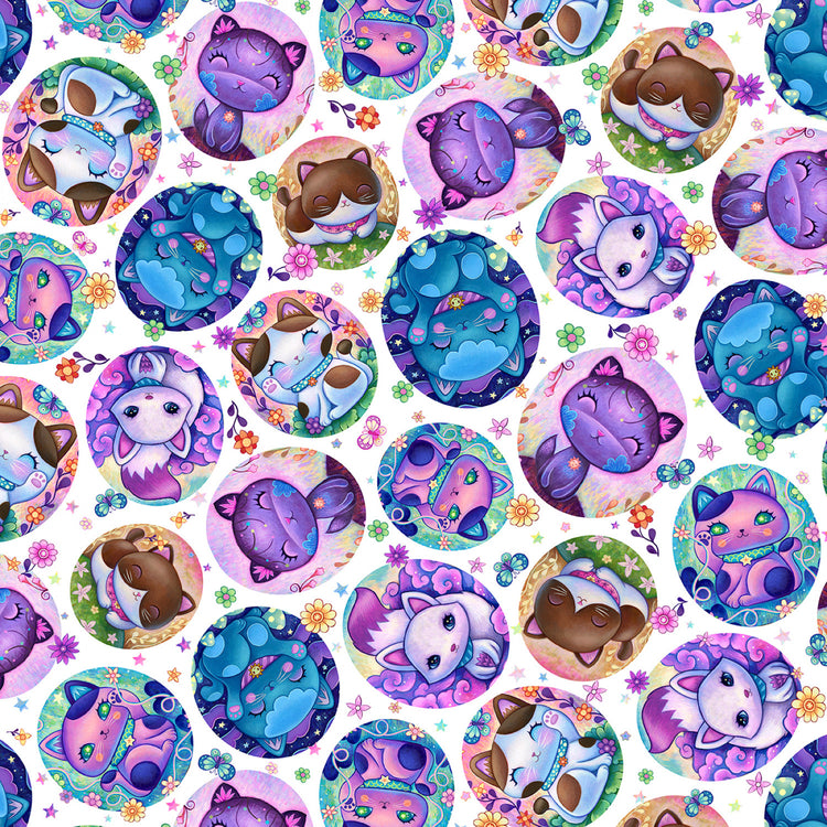 This fabric from the Crazy Kitties collection by Jeremiah Ketner is a dynamic tossed print set against a white background. It features vibrant playful cats in quirky poses, surrounded by fun details like swirling string, stars, flowers, and butterflies. It is an excellent choice for adding depth and whimsy to quilts, bags, or home decor projects. This print is perfect for cat lovers and anyone who enjoys a lively, eye-catching fabric.