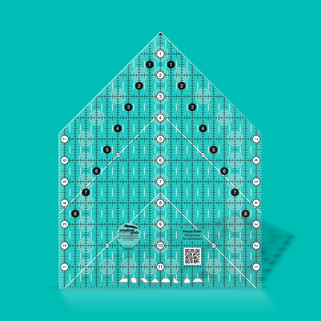 This multi-purpose House ruler is designed to cut a multitude of shapes. Half-square triangles; quarter-square triangles; trapezoids; parallelograms; diamonds from squares and rectangles; house shapes; barn shapes are fast, easy and accurate to cut with this one ruler.The ruler slides easily over the fabric until pressure is applied. Then, an exclusive gripper holds the fabric in place while cutting, eliminating slipping and miss-cuts!