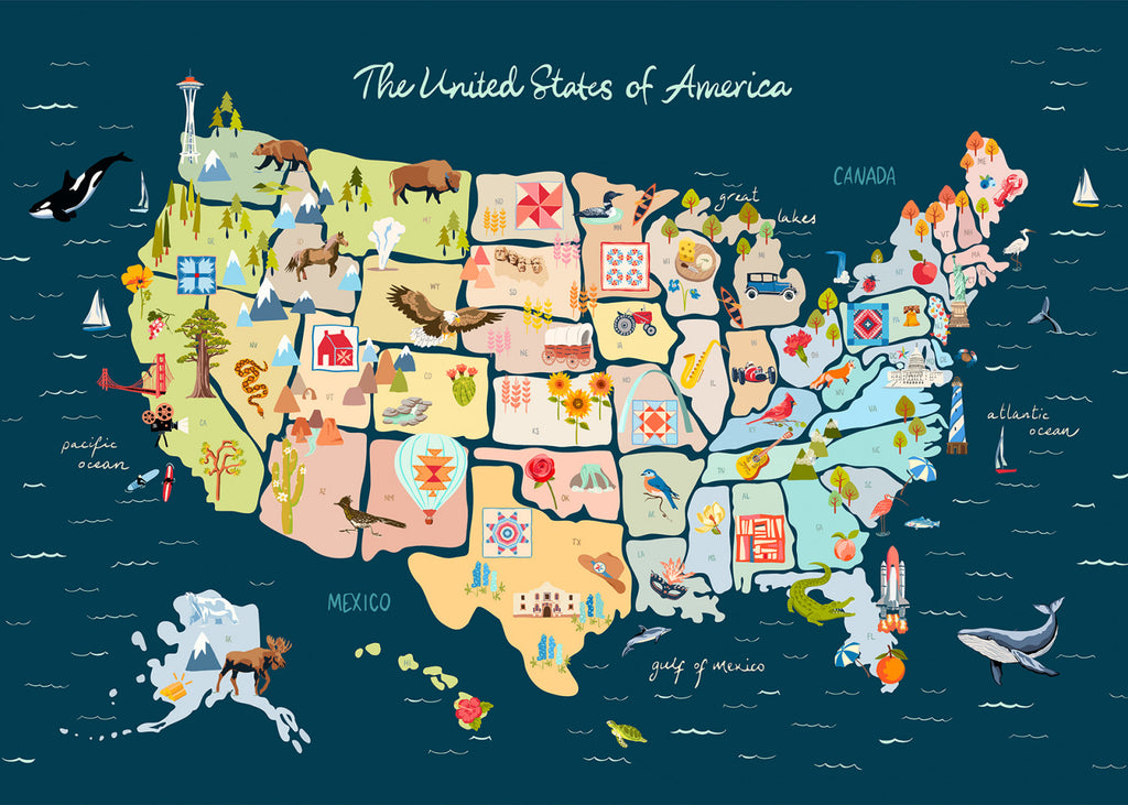This vibrant fabric features a detailed and colorful map of the United States, showcasing each state with unique icons representing local landmarks, wildlife, and cultural symbols. The design is set against a deep navy background, making the bright, varied colors of the states stand out vividly. Ideal for educational projects and patriotic-themed crafts, this fabric combines both educational value and aesthetic appeal.