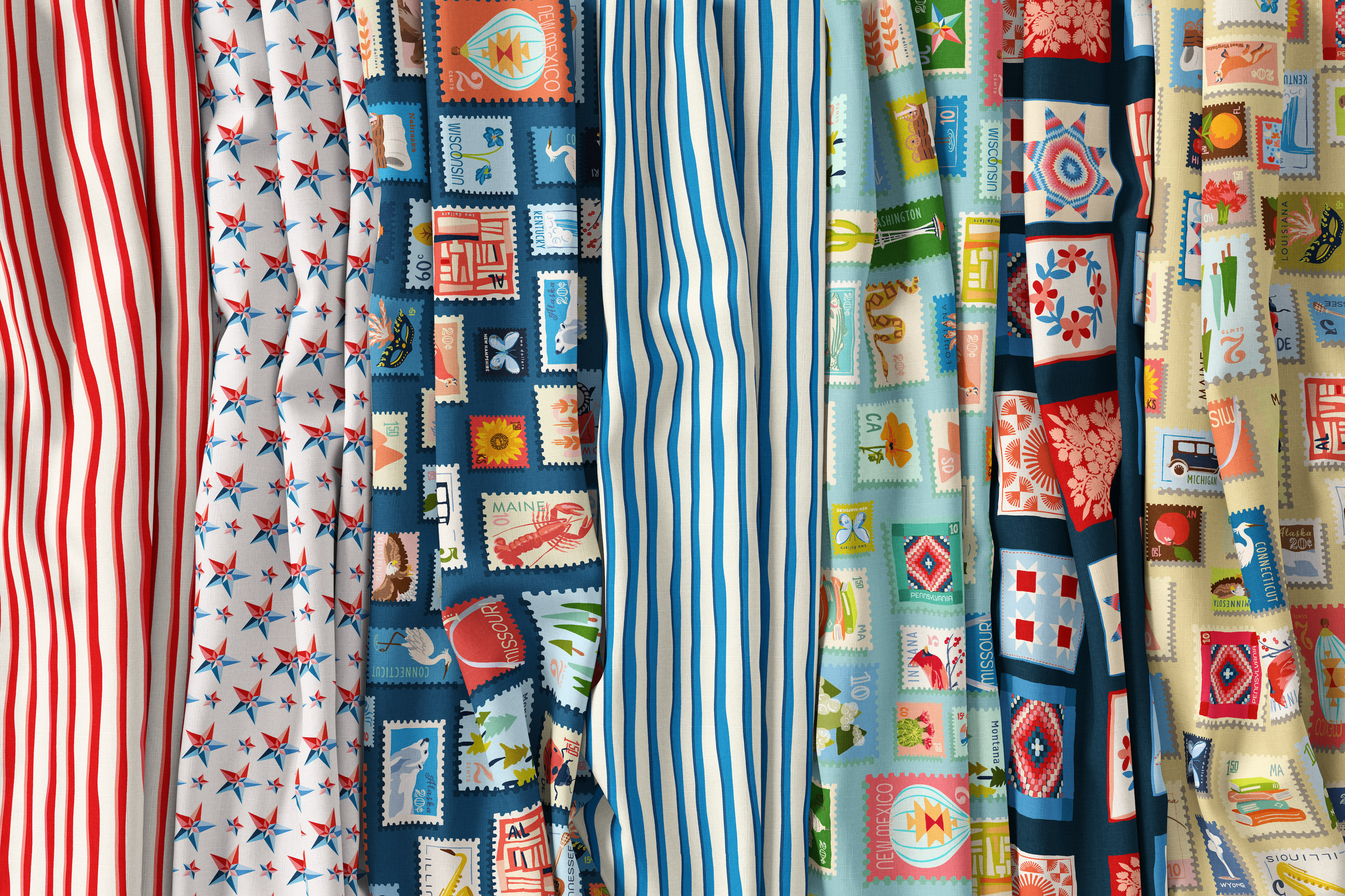 This vibrant fabric features a delightful array of postage stamp designs, each showcasing various elements like hot air balloons, birds, flowers, and state abbreviations, all set against a warm, light beige background. The stamps are intricately detailed with a retro aesthetic, making this fabric perfect for projects that need a touch of nostalgia and charm. Whether you're crafting for personal use or for a business project, this fabric's unique design will add a distinctive flair to any creation.
